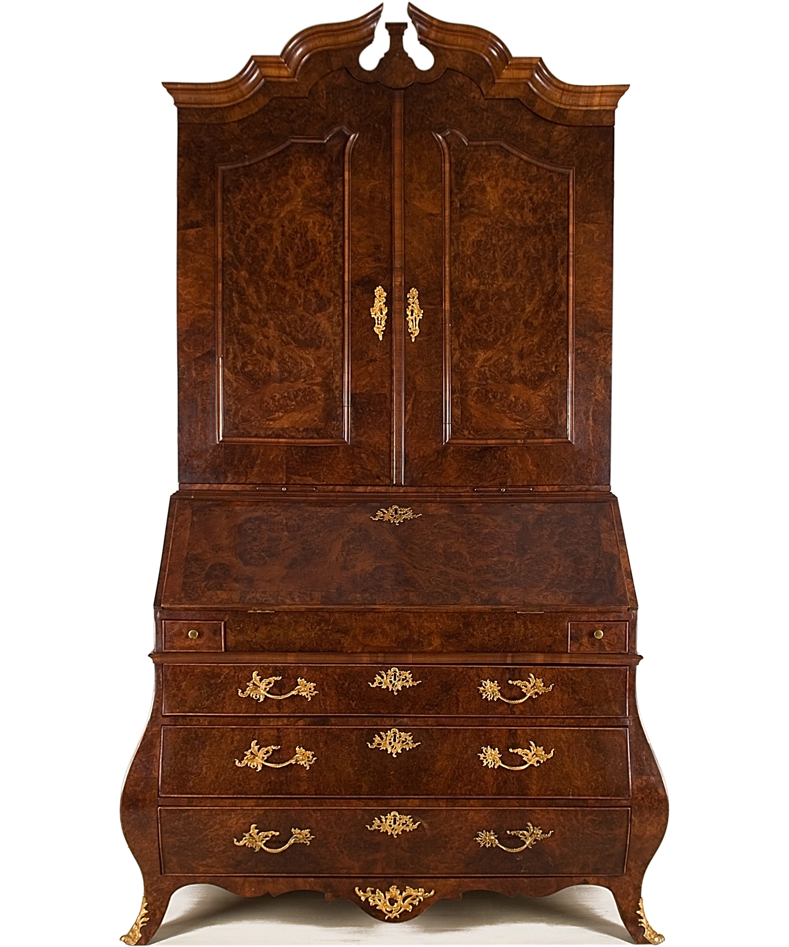 De gebombeerde onderkast bestaat uit drie laden die voorzien zijn van elegant rococobeslag. Ook het schortje in de onderregel is voorzien van mooi beslag en de cabriolepoten van sabots.