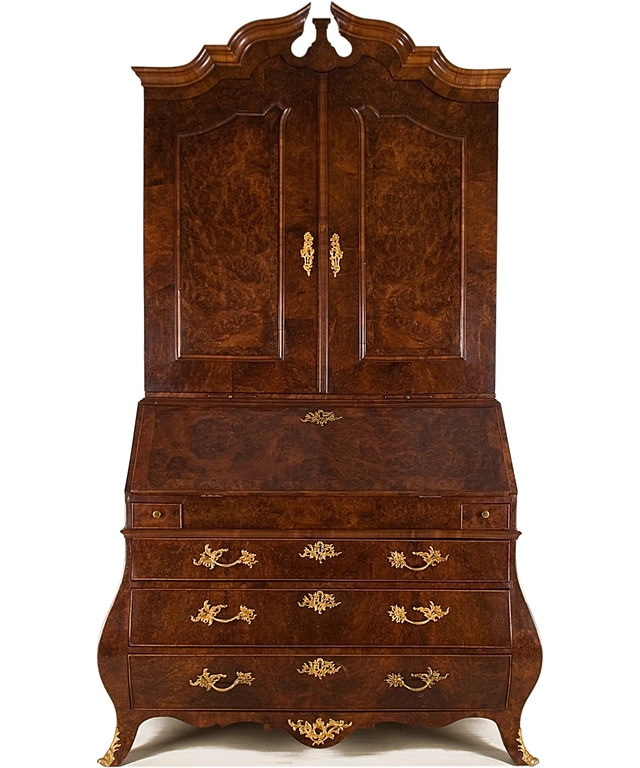 De geprofileerde en gewelfde kaplijst met doorbroken fronton is gebaseerd op Engelse voorbeelden. Het topbureau is dan ook als meubeltype afgeleid van het Engelse ´Bureau-Cabinet´ en deed zijn intrede in Nederland in het eerste kwart van de 18e eeuw. De deurpanelen en de daarop geplaatste sierlijsten volgen de vormen van de kaplijst. In het interieur van de bovenkast bevinden zich drie boekenplanken en onderin een rij met drie laatjes.