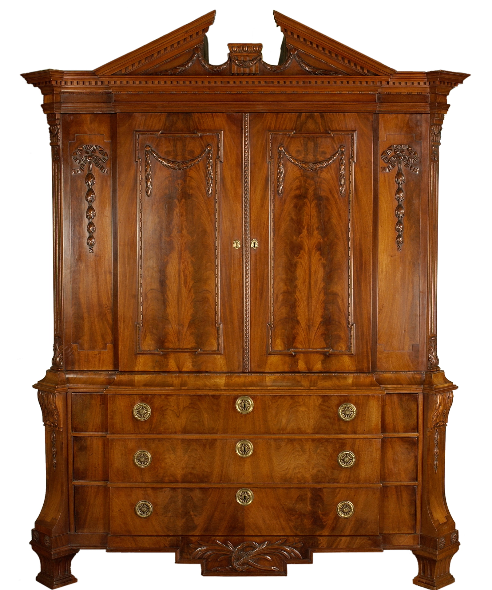 Dit type kabinet, met een naar voren springende middenpartij, is ontleend aan de Engelse meubelkunst. Het gebroken fronton is met tandlijsten en snijwerk versierd. Het snijwerk op de gecanneleerde overhoekse zijstijlen, het fronton en de kaplijst en deurpanelen bestaan uit astragaallijsten, festoenen, acanthusbladeren en vlechtlijsten.