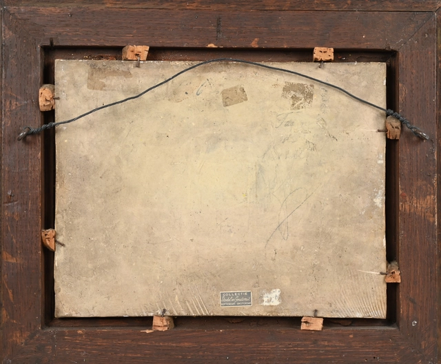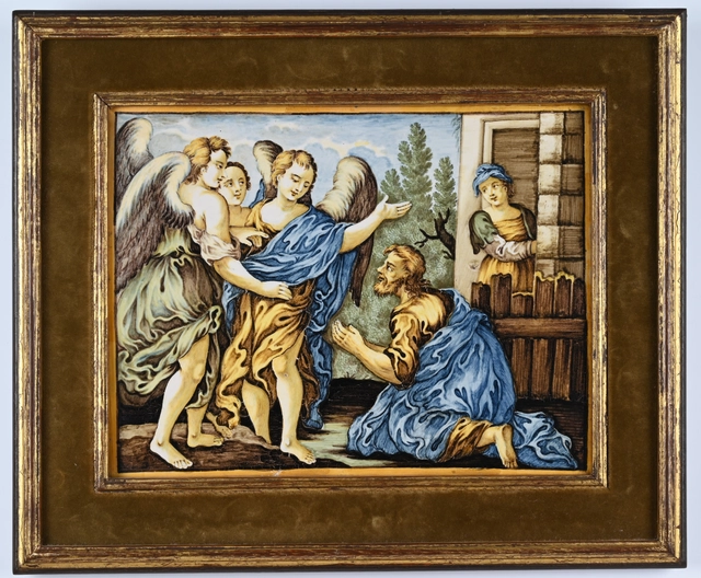 De voorstelling op deze majolica plaquette vertelt het verhaal van Abraham, die bezoek krijgt van drie engelen, die de zwangerschap van Sarah aankondigen.