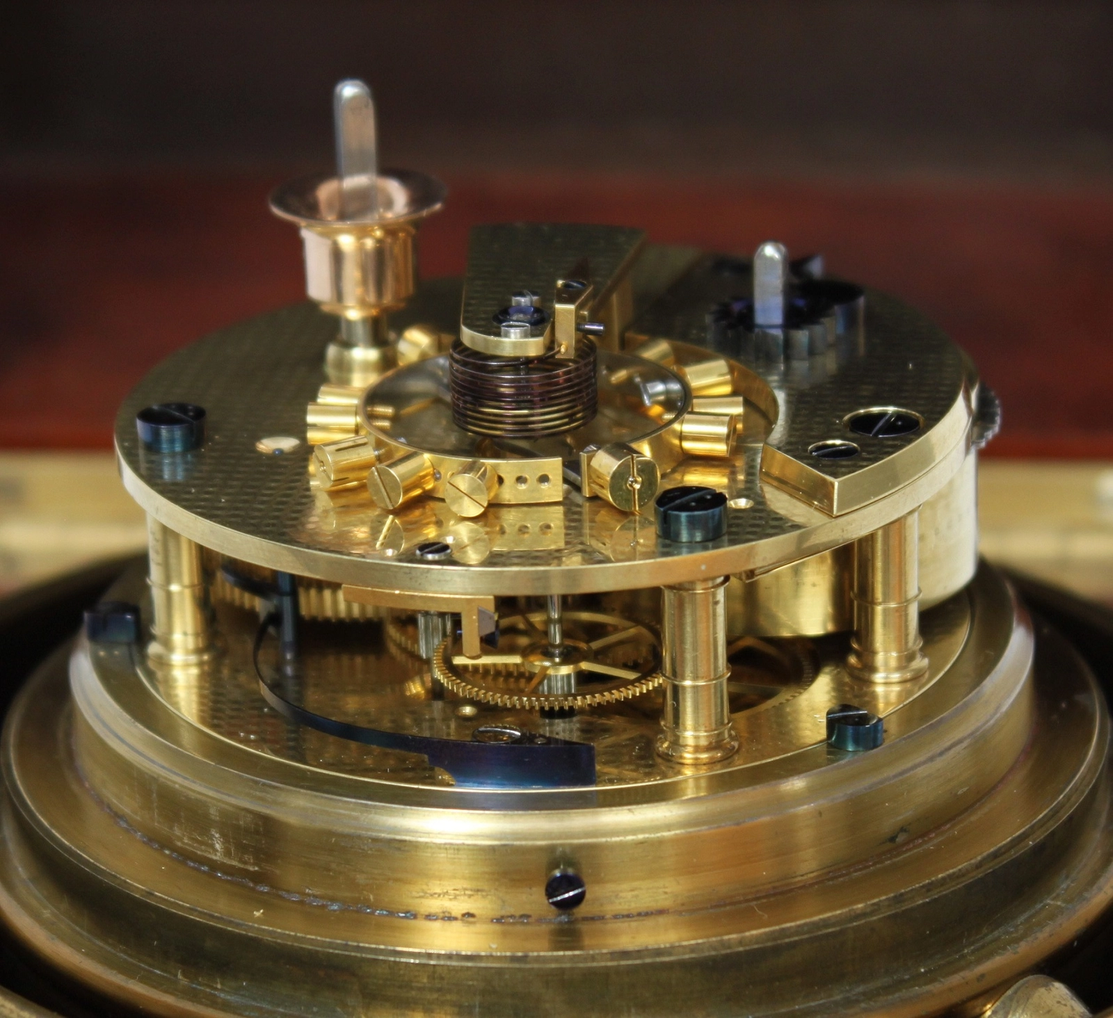 Het zeer fraai vervaardigde uurwerk heeft gespotte platines die verbonden worden met fraaie geringde pilaren. Het heeft een gangduur van 56 uur en wordt aangedreven door een veerton met snek en ketting. Om te zorgen dat het uurwerk blijft doorlopen tijdens het opwinden heeft het Harrison’s maintaining power. De gang wordt gereguleerd door een vrij slingerende compensatiebalans in combinatie met Earnshaw’s detent chronometerechappement.