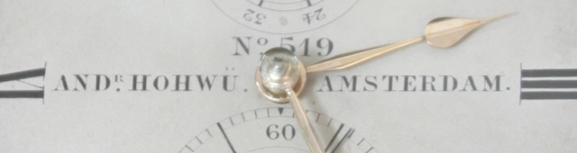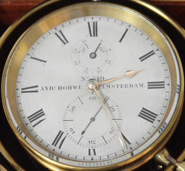 De 8.5-cm doorsnee gegraveerde en verzilverde wijzerplaat heeft Romeinse cijfers en is gesigneerd No. 519 ANDr. HOHWÜ AMSTERDAM. De gouden wijzers zijn van het ‘schoppen’ type. Onder de XII is de aanduidng van de gangreserve (op/af) die aangeeft hoe lang de chronometer nog kan lopen op de veerton. Dit was natuurlijk erg belangrijk want een chronometer mocht natuurlijk niet stil staan. Boven de VI is de secondewijzer.
