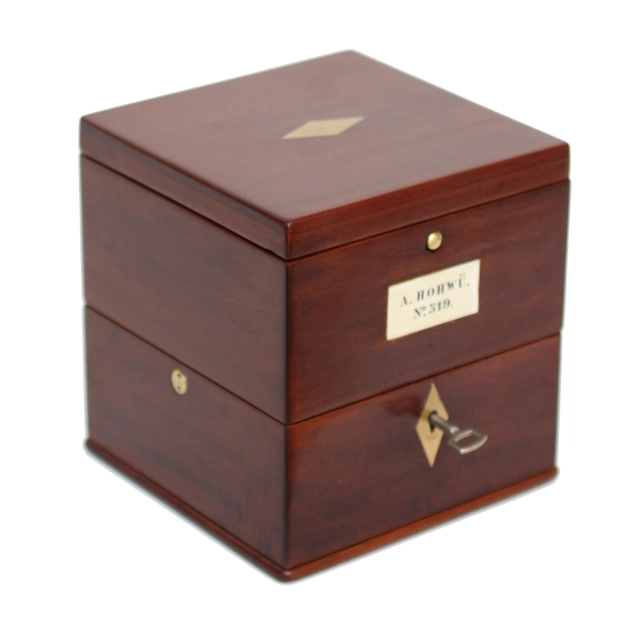 Het uurwerk heeft een aparte messing binnenkast die met een bajonetsluiting vast zit. Deze kast zit op zijn beurt weer in een messing kast met onder het afsluitbare opwindgat. Het geheel is cardanisch opgehangen in een drie-delige mahoniehouten kist met messing monturen. Aan de voorzijde is een plaquette die gesigneerd is A. HOHWÜ No. 519.