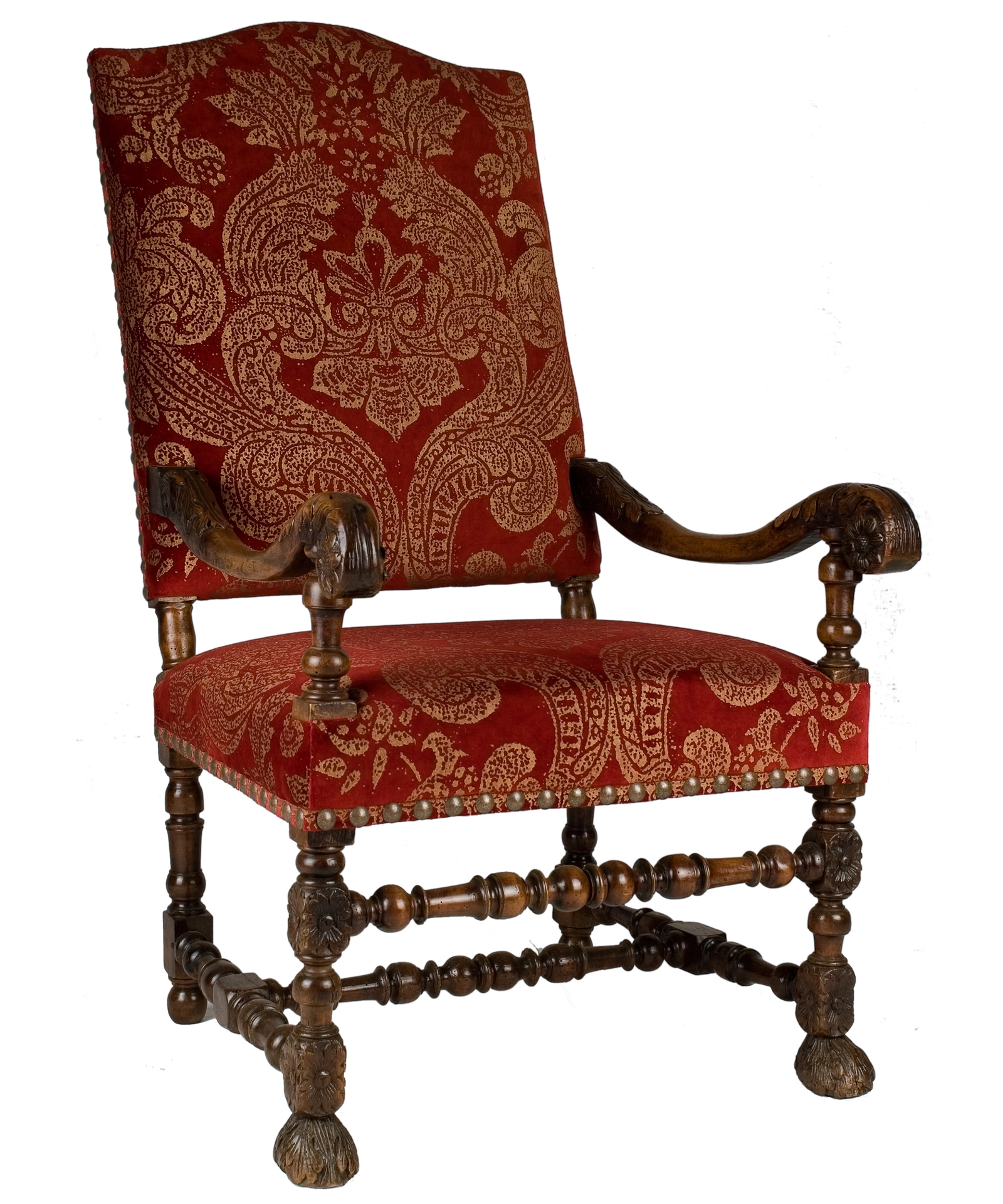 Deze armstoel uit het derde kwart van de zeventiende eeuw is voorzien van de voor die tijd kenmerkende hoge, iets schuin naar achter geplaatse rug. De sierlijk hoog oplopende armleggers zijn organisch gedecoreerd met snijwerk van acanthusbladeren en bloemen. De poten, kruis voorsport en stutten voor de armleggers zijn voorzien van draaiwerk.