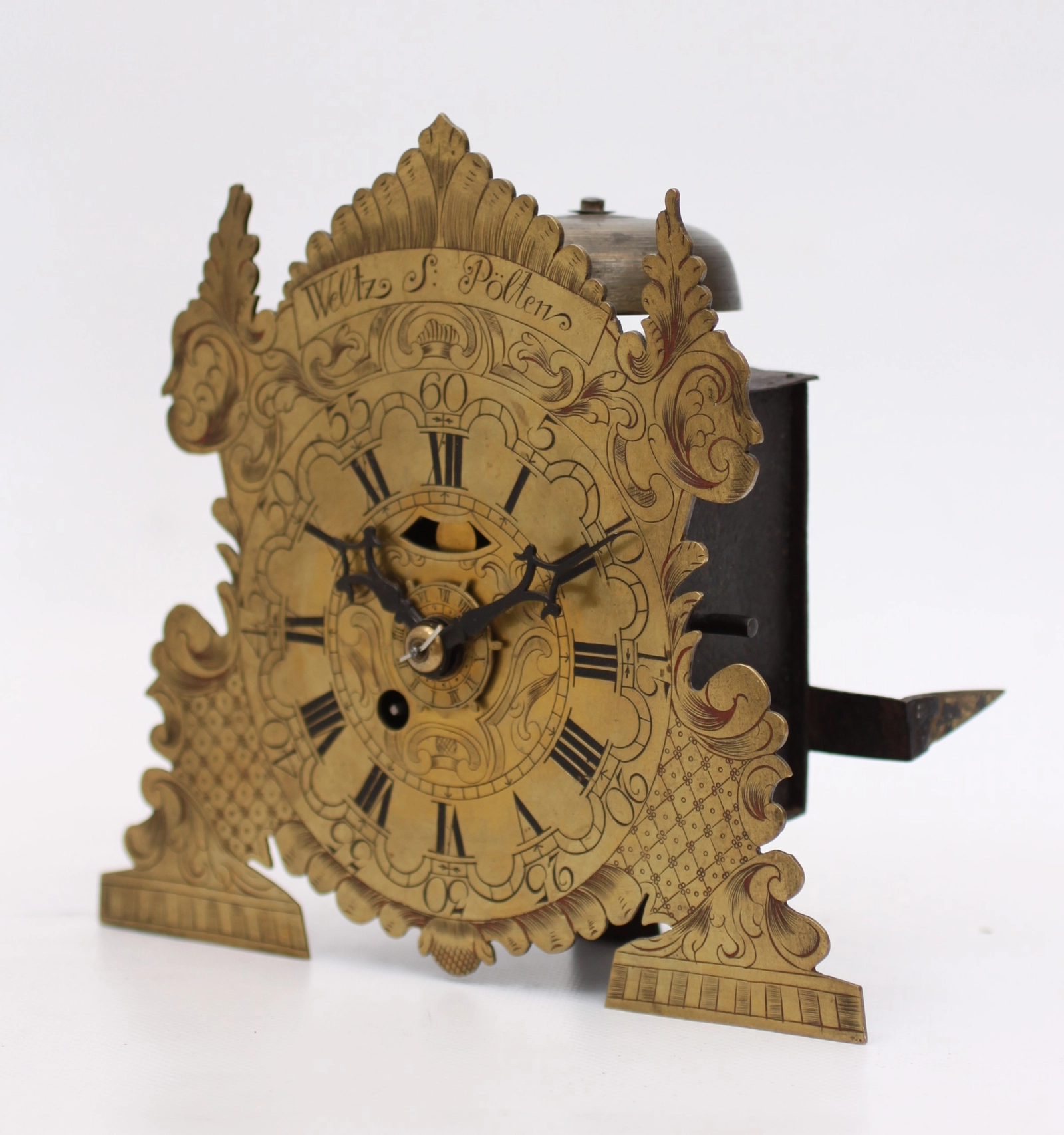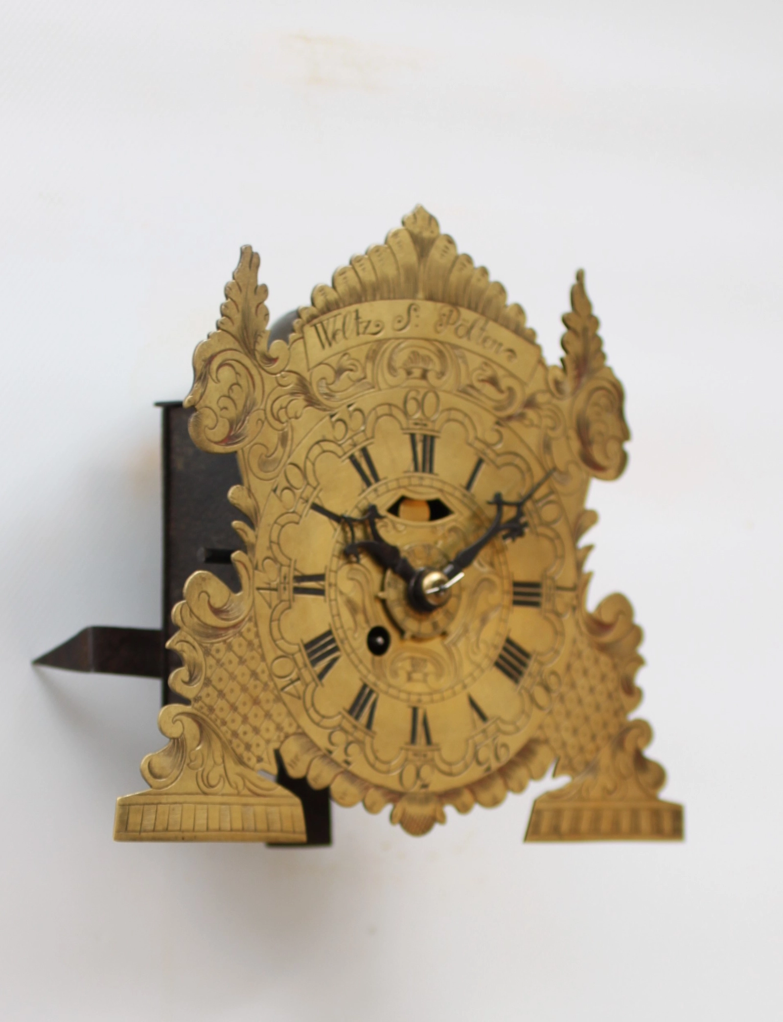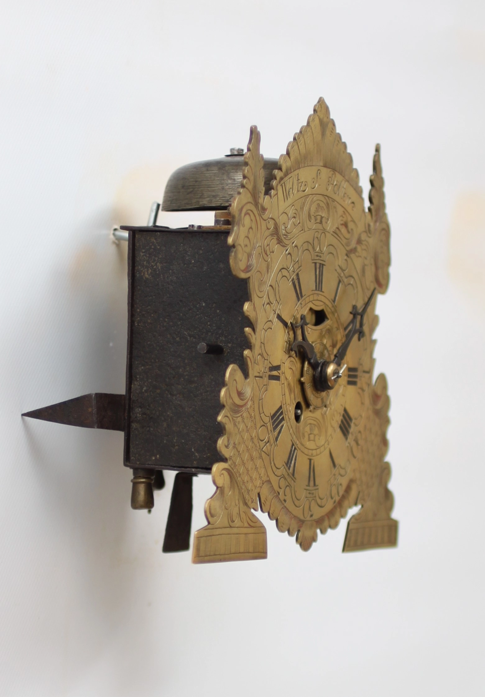 Een Zwitserse messing en ijzeren 'Kuhschwanz' wandklok, circa 1720