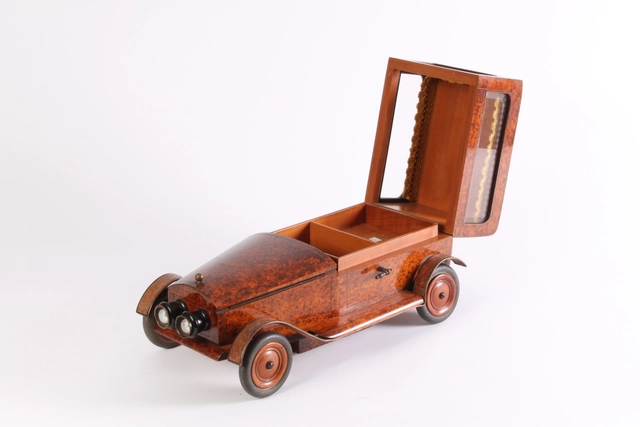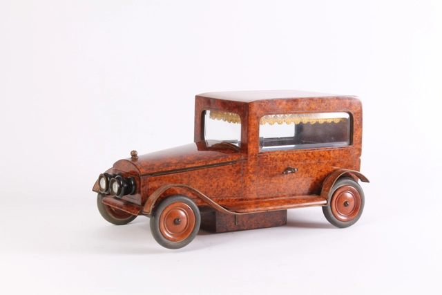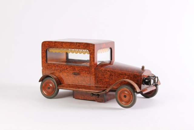 Een Art Deco brons marmer en ivoor beeldje van een auto, circa 1920.