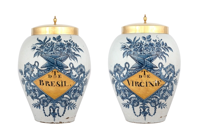 De ovoide vorm van dit paar tabakspotten is voorzien van een zeldzame decoratie. De ruitvormige gele cartouche is omgeven door bloemmotieven en guirlanders en bekroond met twee gekruiste sigaren en bloemen. Inscriptie in de cartouche is in het frans: "TDE BRESIL," and "TDE VIRGINIE,", staat voor "Tabac de Bresil" en " Tabac de Virginie". De koperen deksels zijn van latere datum.