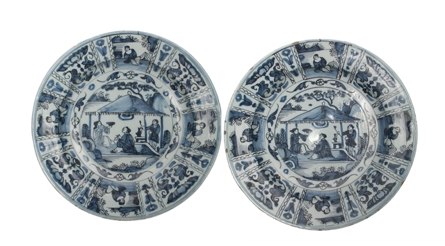 Deze set borden is gedecoreerd naar voorbeeld van het Chinese Kraakporselein in **Wanli-stijl**. De vlakken in de randdecoratie zijn alternerend gevuld met een gestileerd bloemornament en en zittende figuur in een landschap. Telkens hiertussen is een smaller vlak met een andere gestileerde florale decoratie.