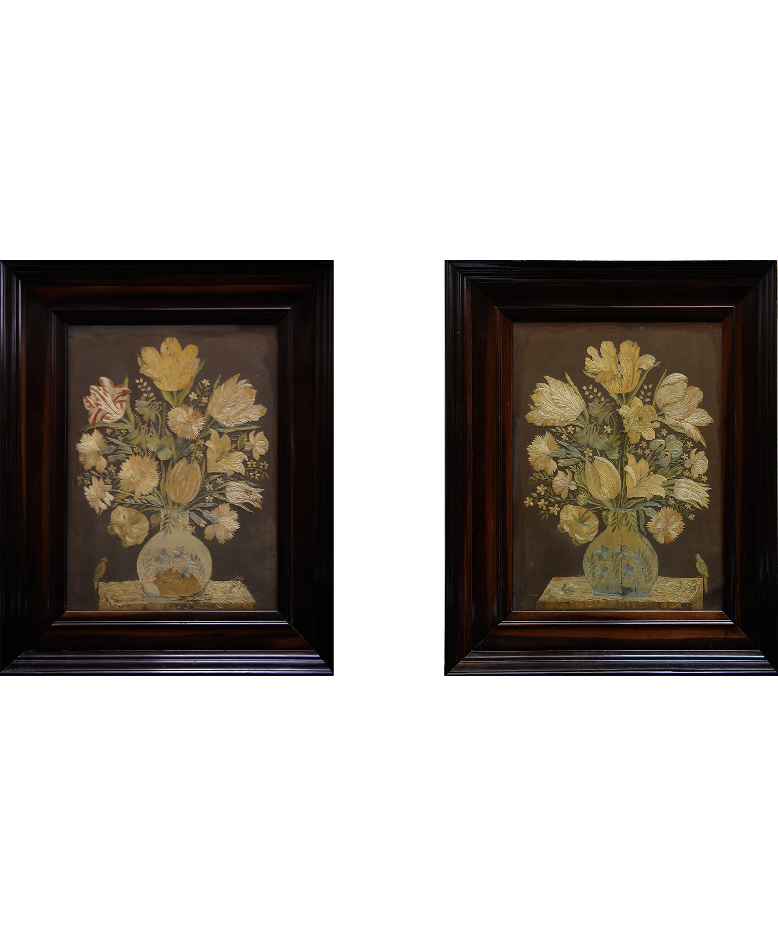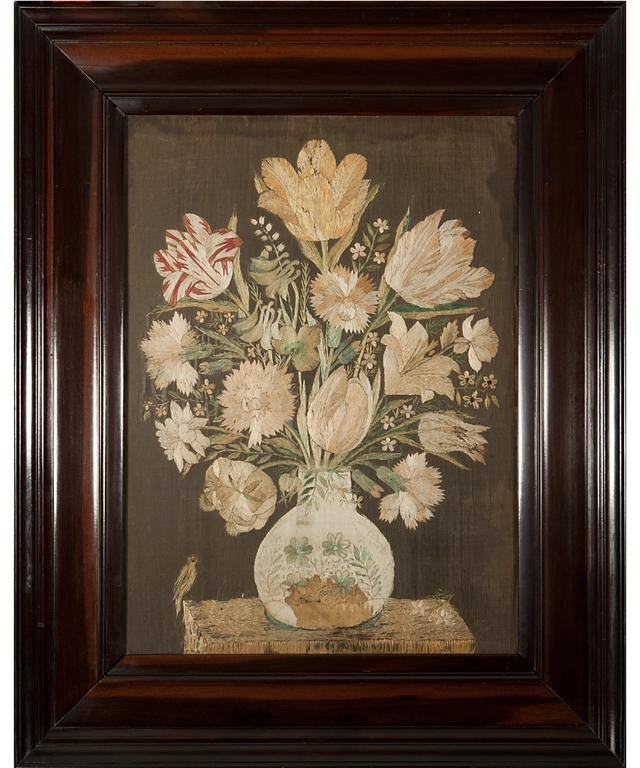 De lijsten waarin de borduurwerken zitten zijn origineel en circa 1670 te dateren, hetgeen uniek te noemen is. De maten van de panelen zijn extreem groot, want de zeer schaarse vergelijkbare borduurwerken uit de 18e eeuw zijn in de meeste gevallen veel kleiner!