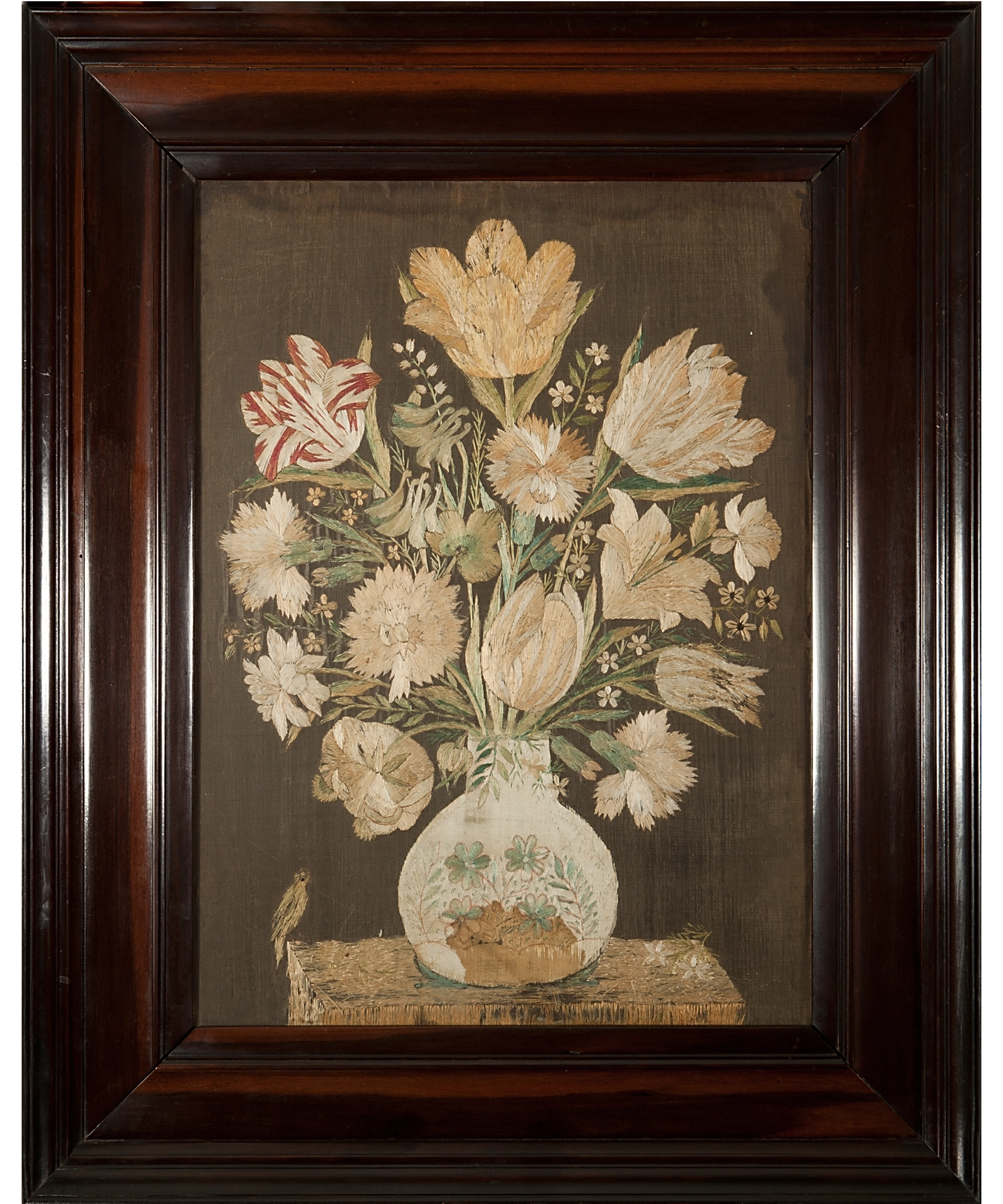 De boeketten, die voor een merendeel uit tulpen bestaan, zijn gerangschikt volgens een patroon dat ook bekend is van de bekende parelmoer- en intarsiawerker en goudsmid Dirck van Rijswijck (1596-na 1679). Ook de Chinees aandoende bolvormige potten met decoratie hebben dezelfde kenmerken. De vogeltjes links en rechts op de plinten zijn in verhouding te klein, een ander punt van gelijkenis.