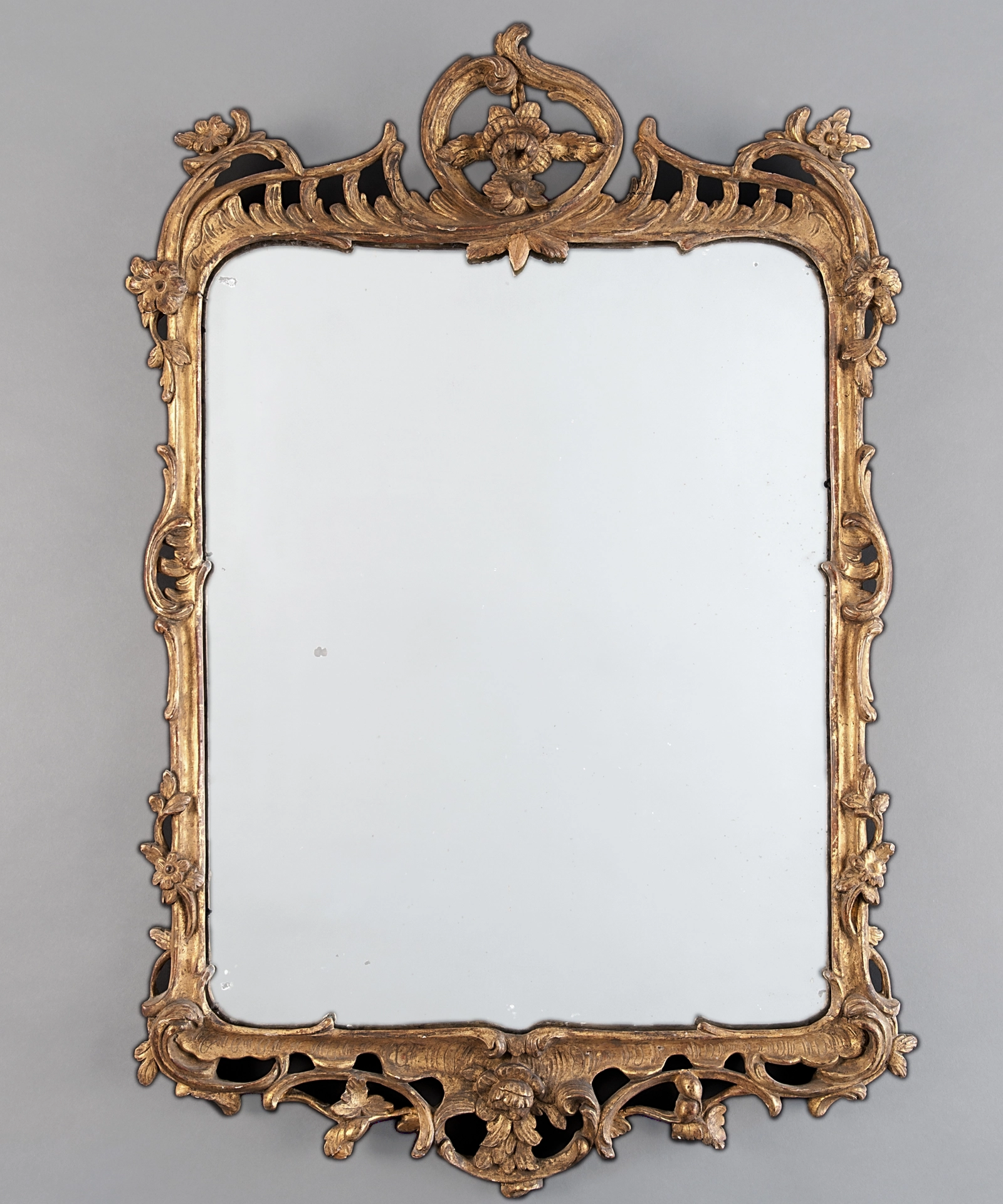 In deels opengewerkte en geprofileerde rechthoekige lijst waarop voluten, rocailles en florale motieven.