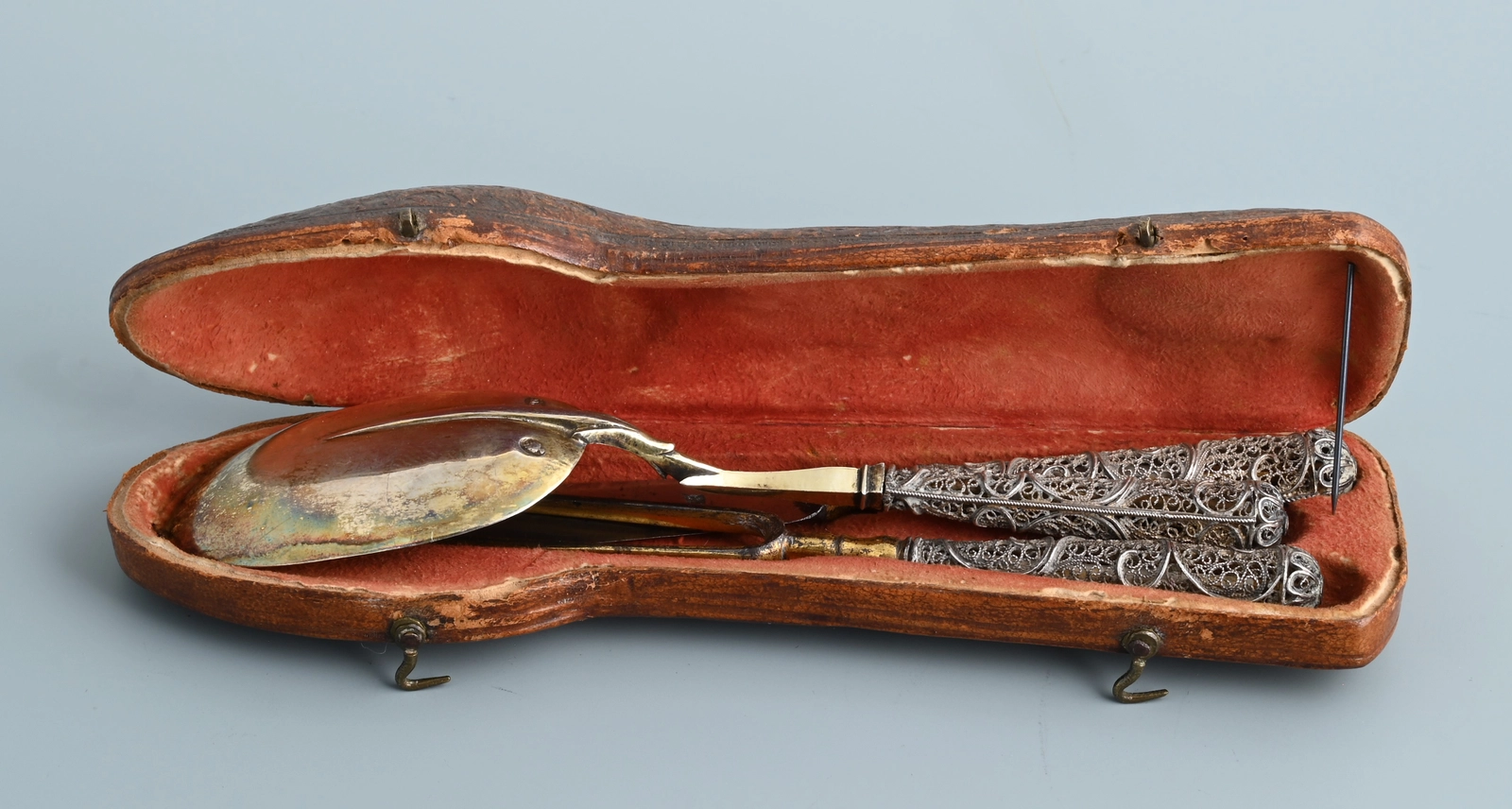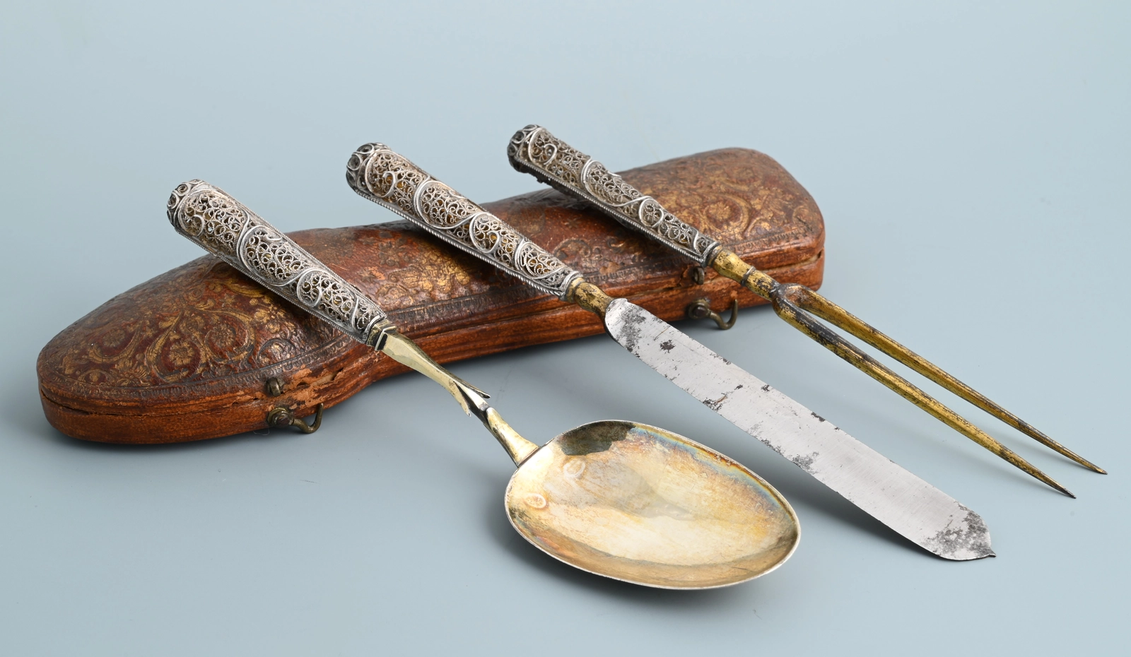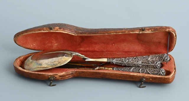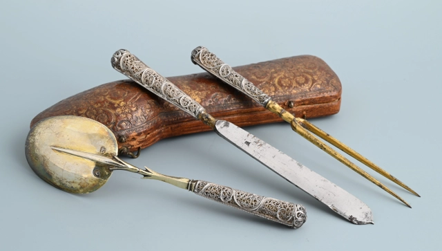 Een reisbestek met zilveren, filigrain uitgevoerde heften.