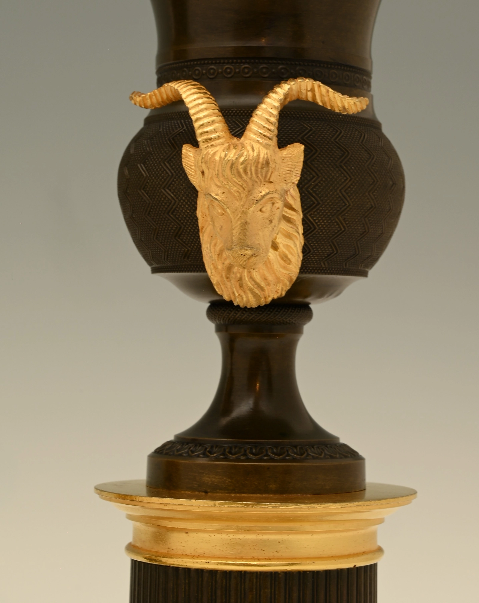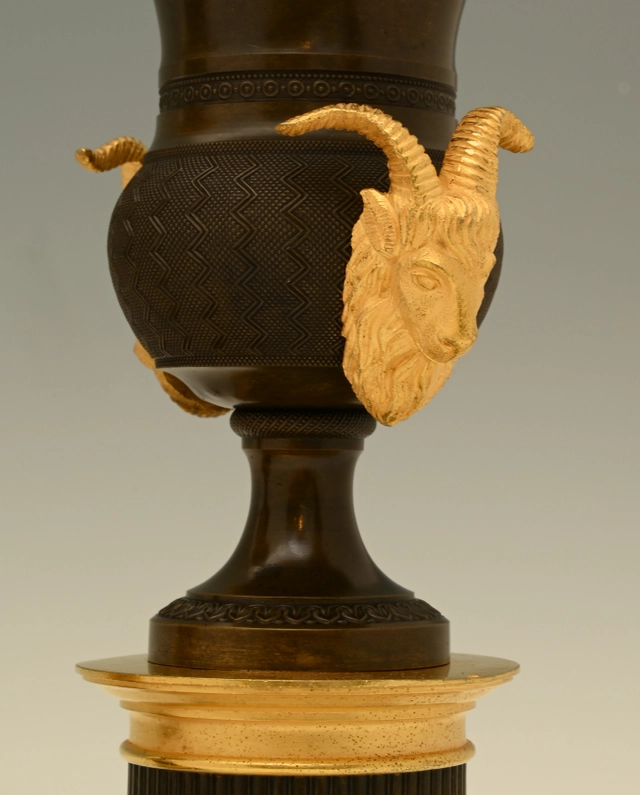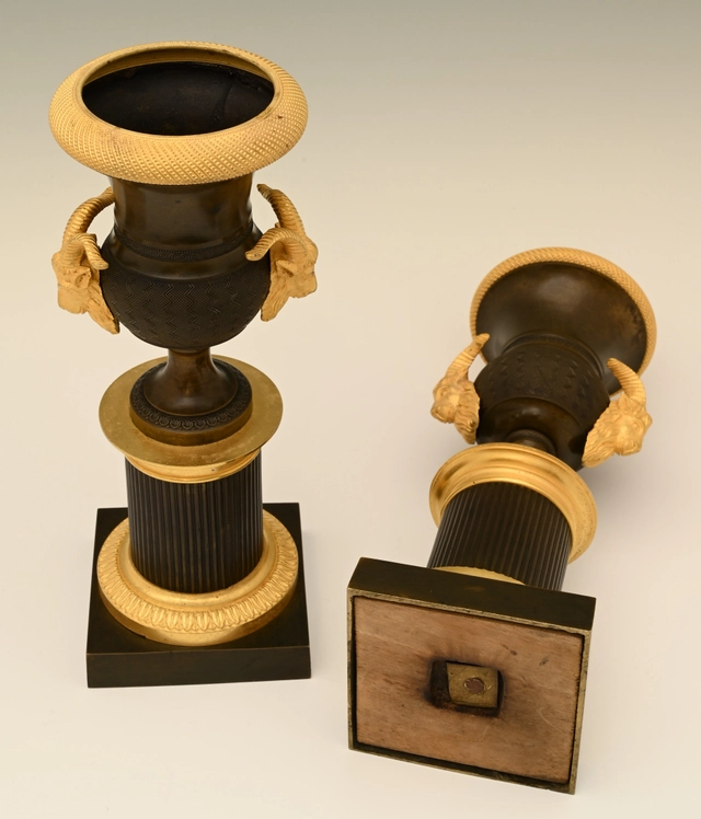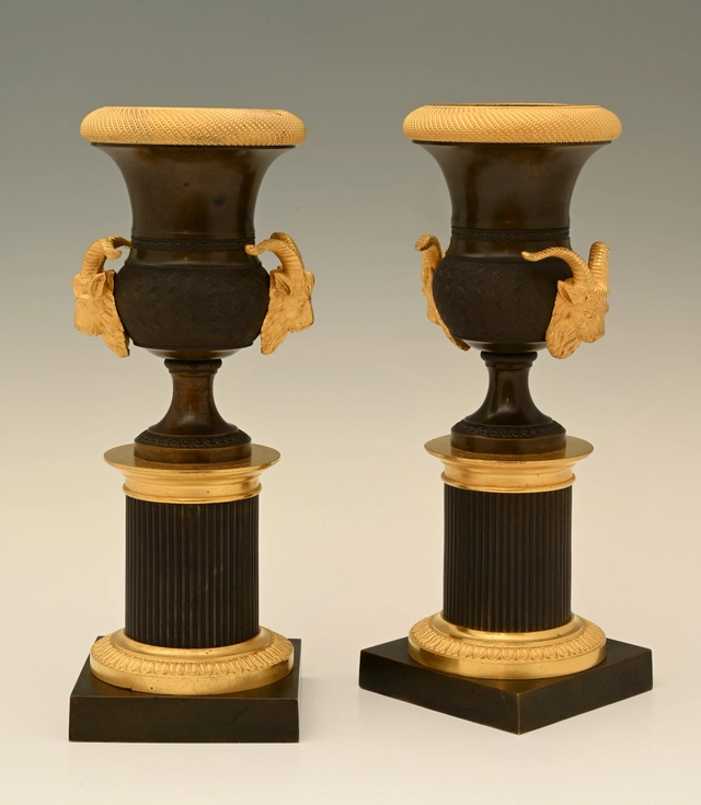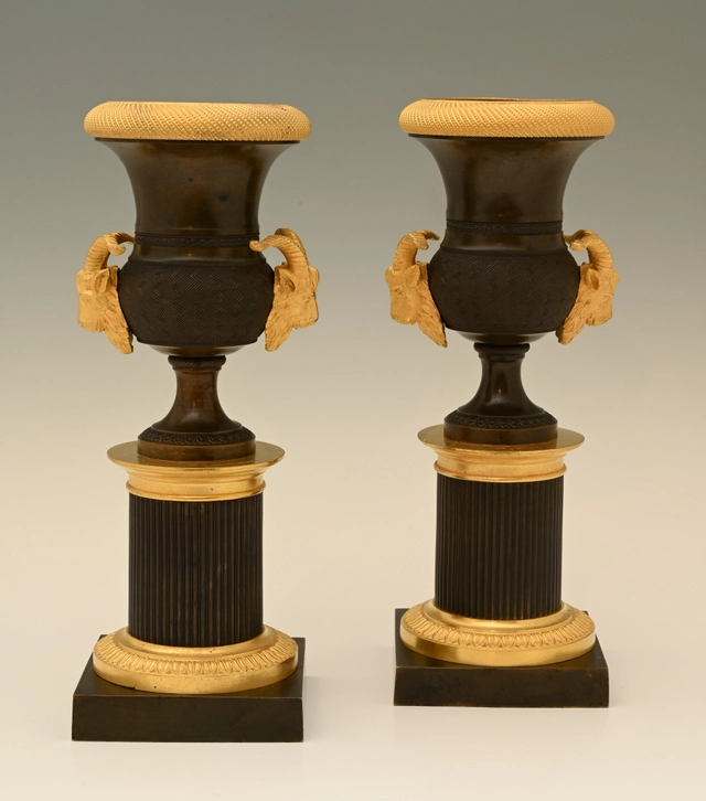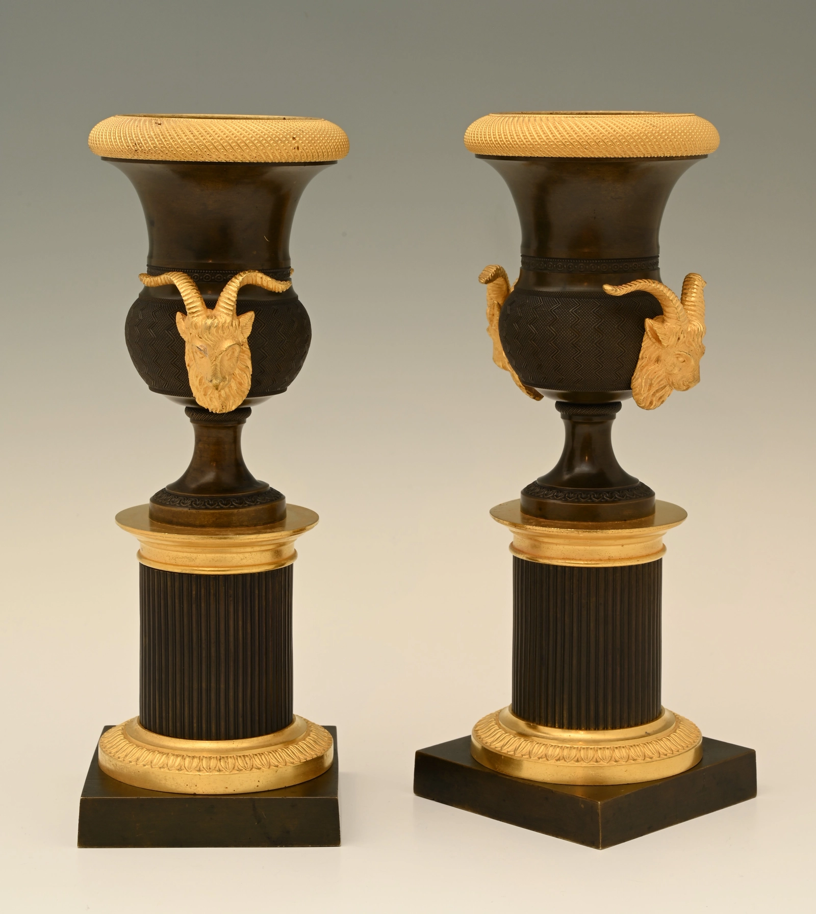 Een stel vuurverguld en gepatineerde bronzen Empire siervasen