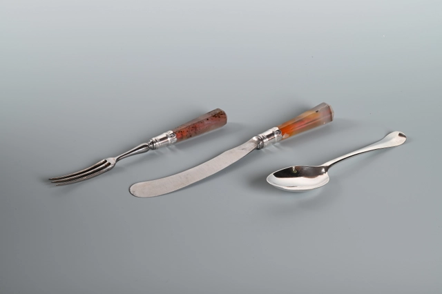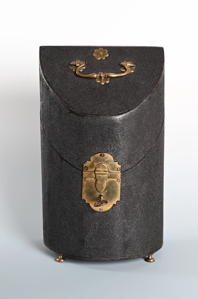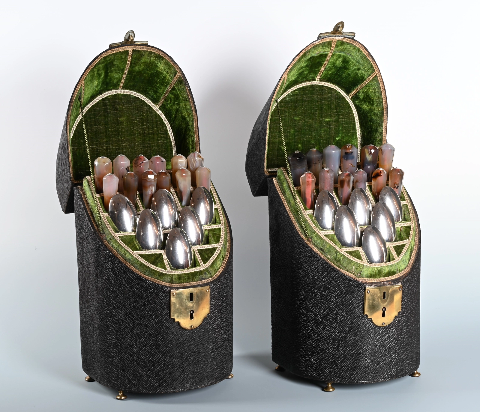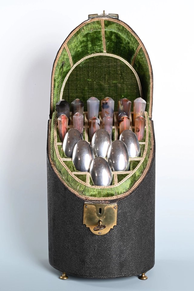 Het unieke en zeldzame van deze set is dat de met haaienhuid bekleedde kist speciaal in 1730 is gemaakt voor dit zilveren bestek.