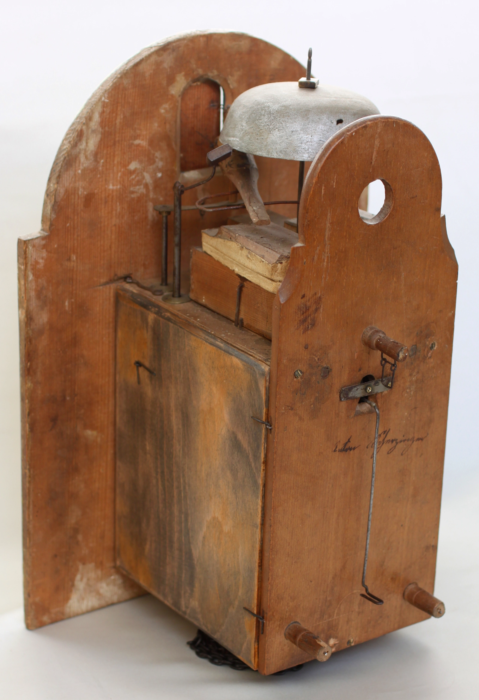 Een klein Duits wandklokje met slagwerk en wekker, circa 1860