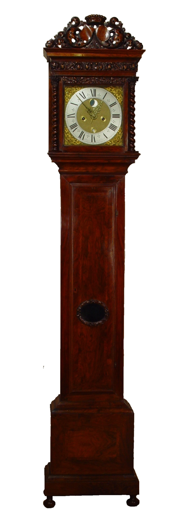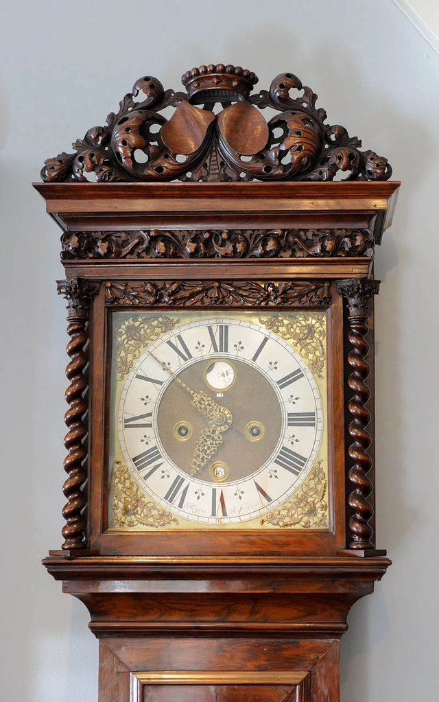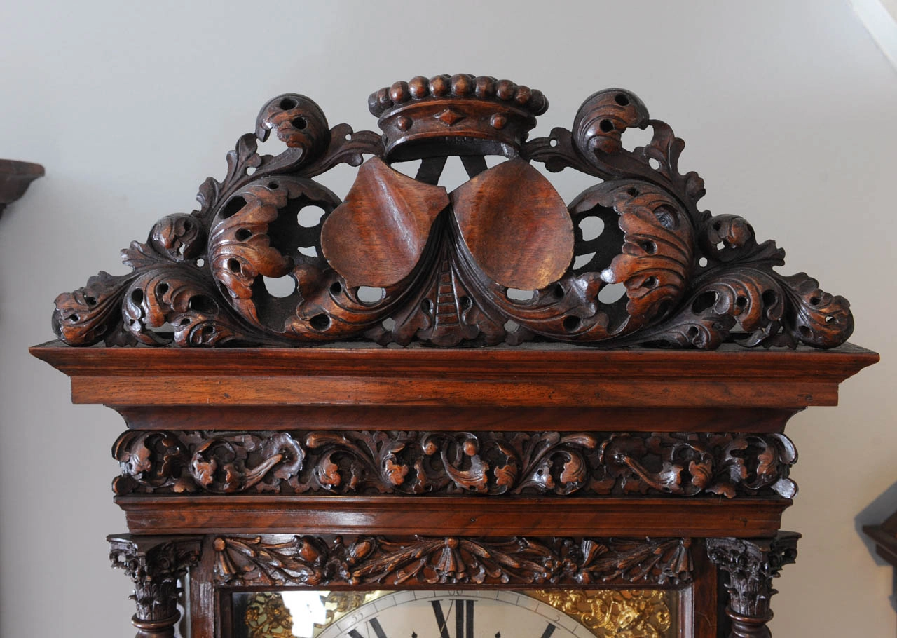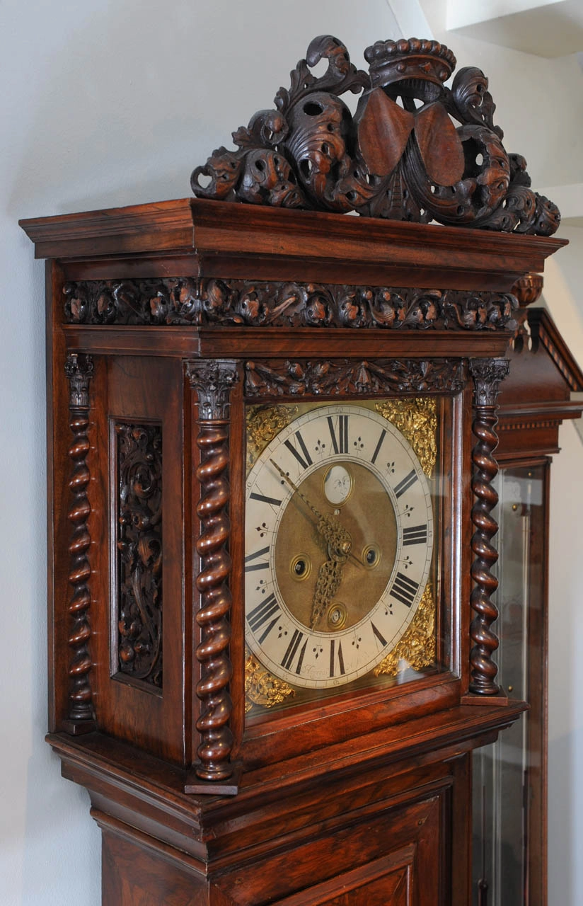 Een Hollandse wortelnoten staande klok met slagwerk en wekker Ed Brookes Amsterdam circa 1725