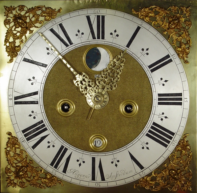 Een vroege Hollandse iepenwortel en ebben staande klok maandloper Huygens Amsterdam circa 1700