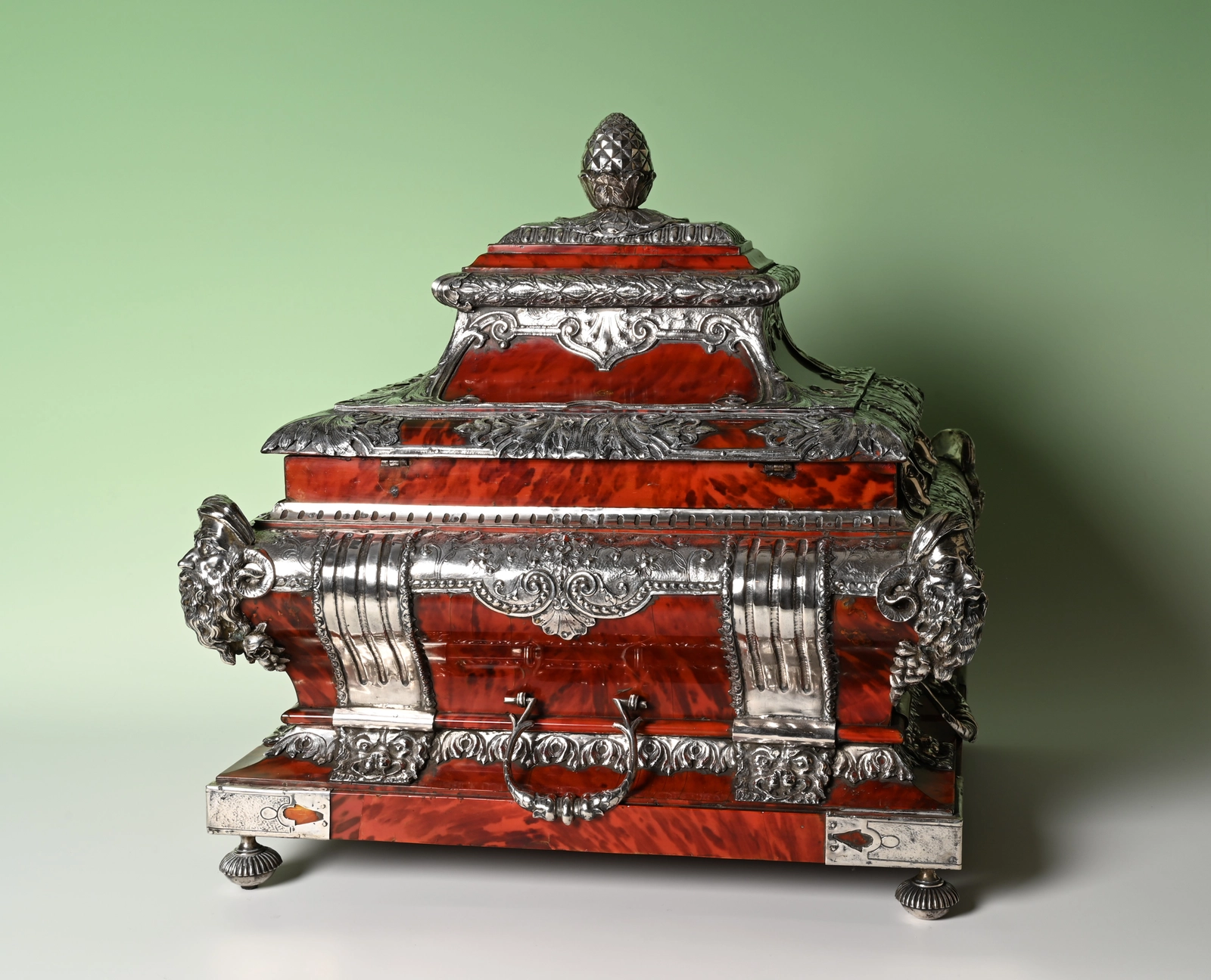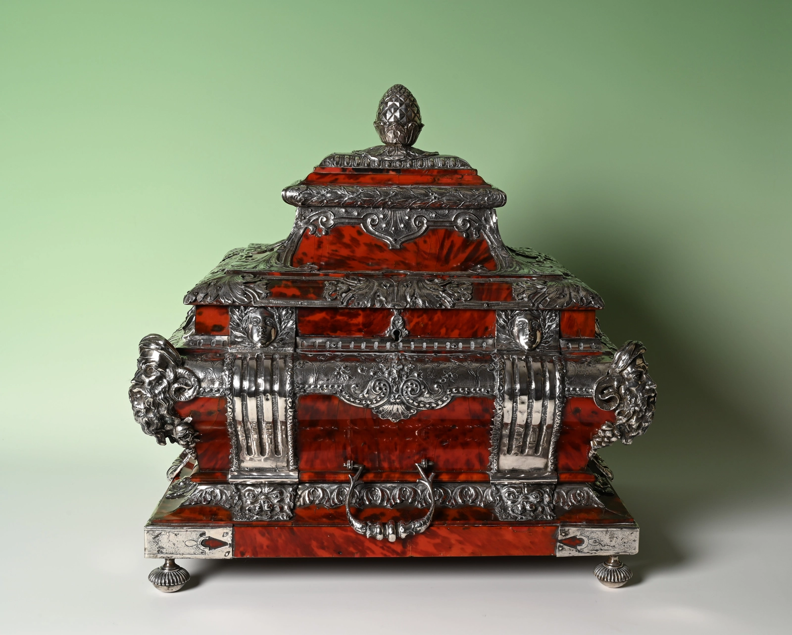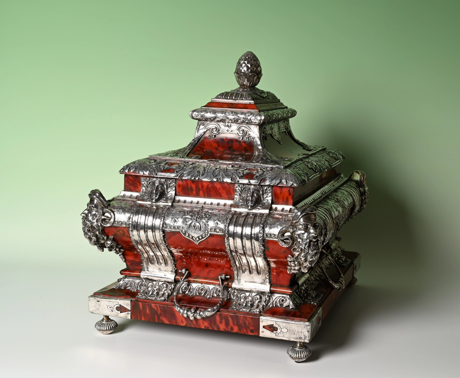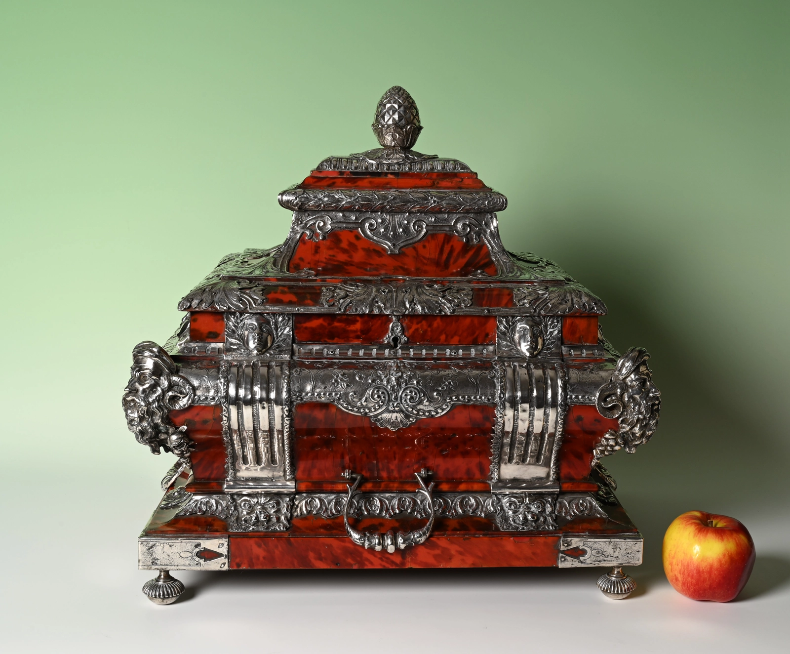 Bekroond met een dennenappel, de randen gedecoreerd met mascarons en dierenkoppen.