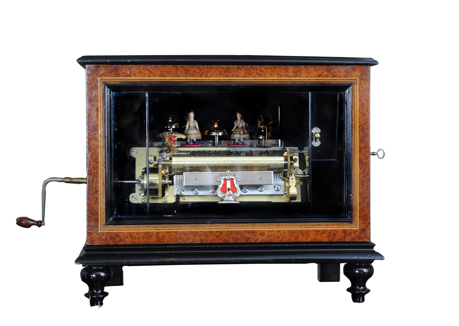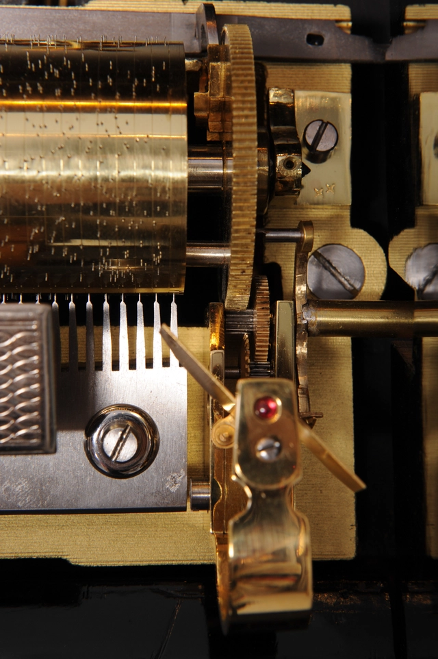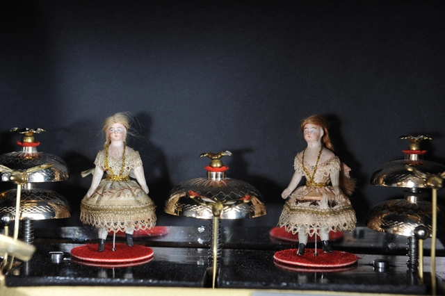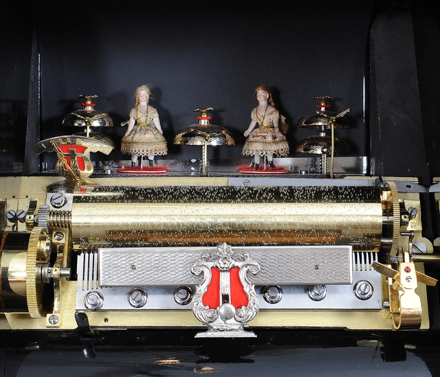 Een imposante Zwitserse mandoline en 'bellen-in-zicht' verwisselbare cylinder speeldoos op bureau, door Samuel Troll, omstreeks 1880