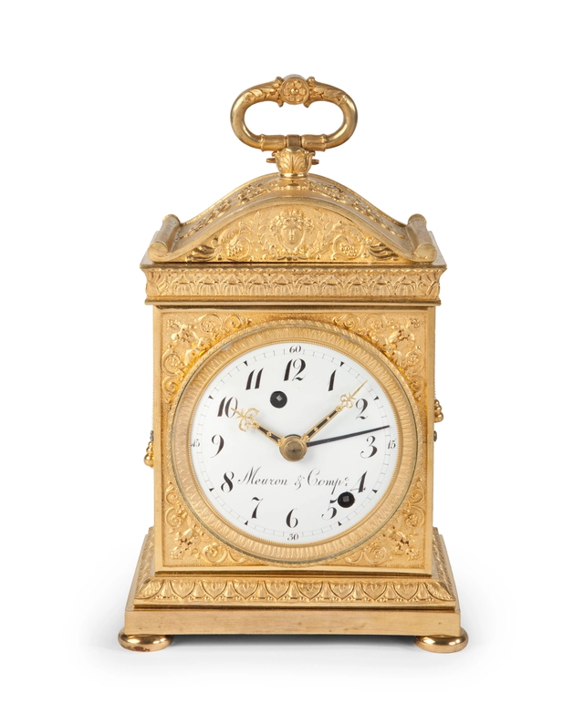 Een bronzen adelaar horlogestandaard met koetshorloge met kwartierrepetitie