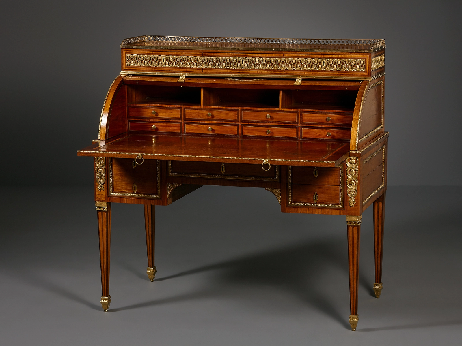 Een elegant cilinderbureau met de typische halfronde klep, die centraal gedecoreerd is met een verhoogd ovaal met een verguld bronzen rand en daarbinnen parqueterie. De verhoogde opstand is aan de voorzijde voorzien van drie laden met een doorlopend vuurverguld geometrisch patroon, en aan de bovenzijde afgezet met een galerijrand. Onder het uitschuifbare schrijfblad, bevinden zich aan de voorzijde vier ladefronten. In het linker ladeblok bevindt zich een kluis. Het bureau wordt gedragen door vier vierkante naar beneden taps toelopende benen die eindigen in verguld bronzen sokjes. Het gehele bureau is langs de randen afgebiesd met verguld bronzen sierstijlen. Het interieur met lederen schrijfblad herbergt nog drie vakjes en vier laatjes.