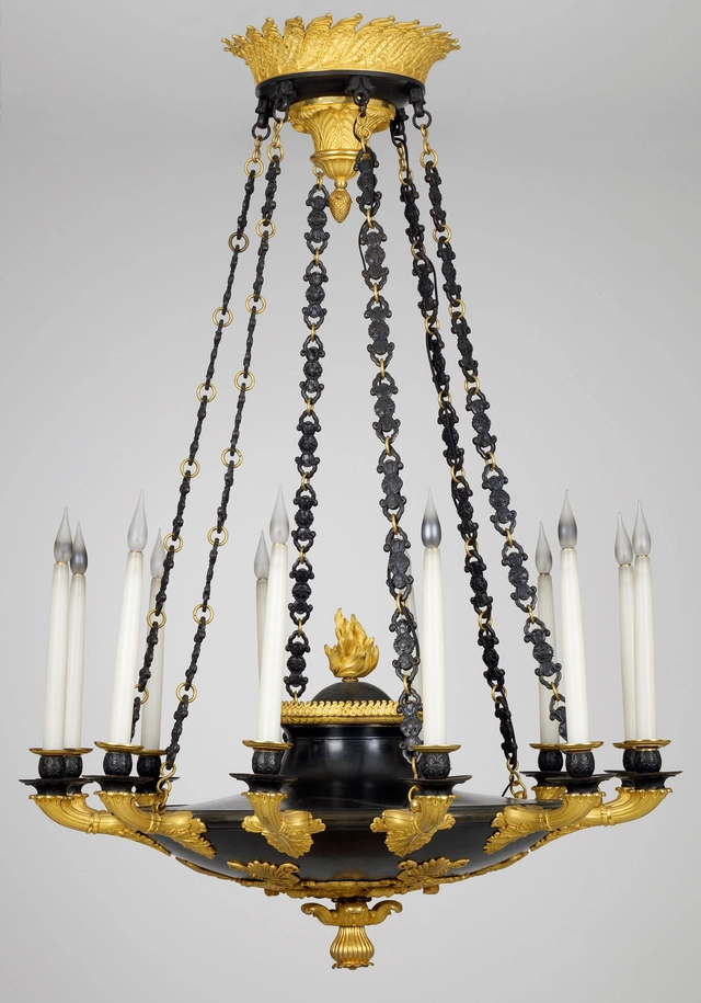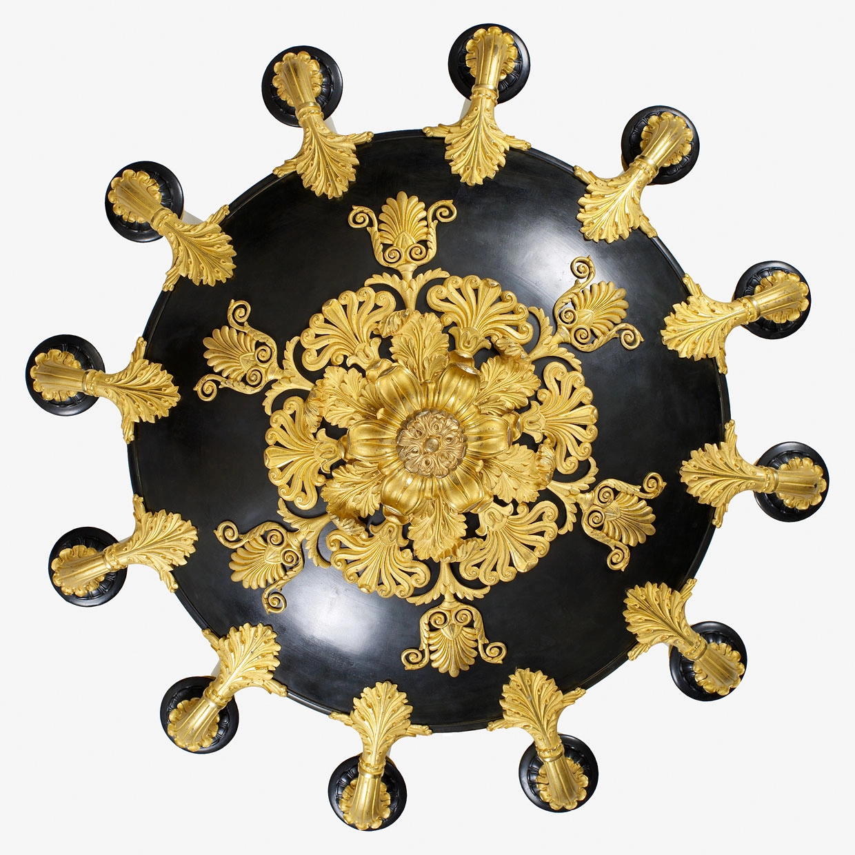 De twaalf forse vuurvergulde armen hebben de vorm van acanthusstengels die met hun blad aan de onderkant van de discus bevestigd zijn. Ze dragen gepatineerd bronzen bobèches met bladvormen, en vergulde vetvangers.
