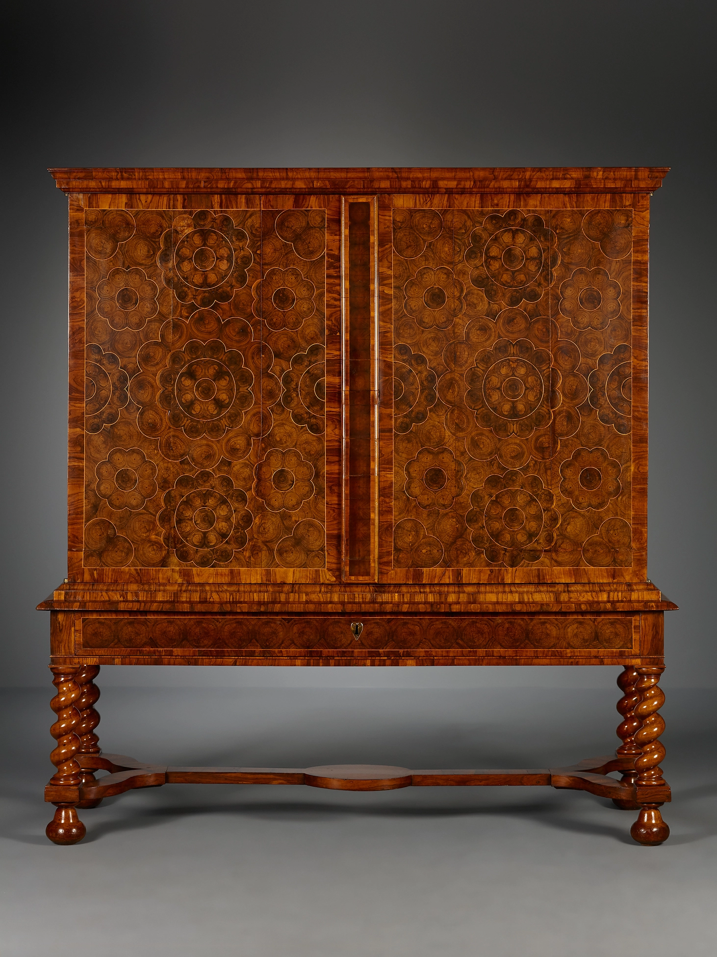 Een kruisvoetkabinet, geheel gedecoreerd met olijfhout. Aan de voor- en zijkanten zijn de grote vlakken versierd met oesterfineer. Satijnhouten biezen omlijsten de olijfhouten oesters in bloemvormige vlakken. De kast wordt gedragen door een open onderstel met een brede lade en vier getorste poten, verbonden door een gekruiste regel, waar het kabinet zijn naam aan ontleent.