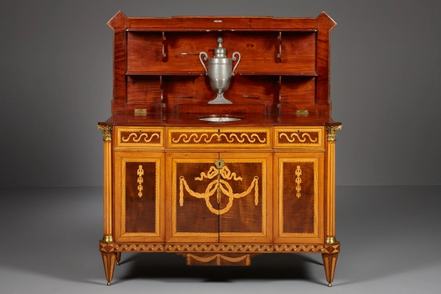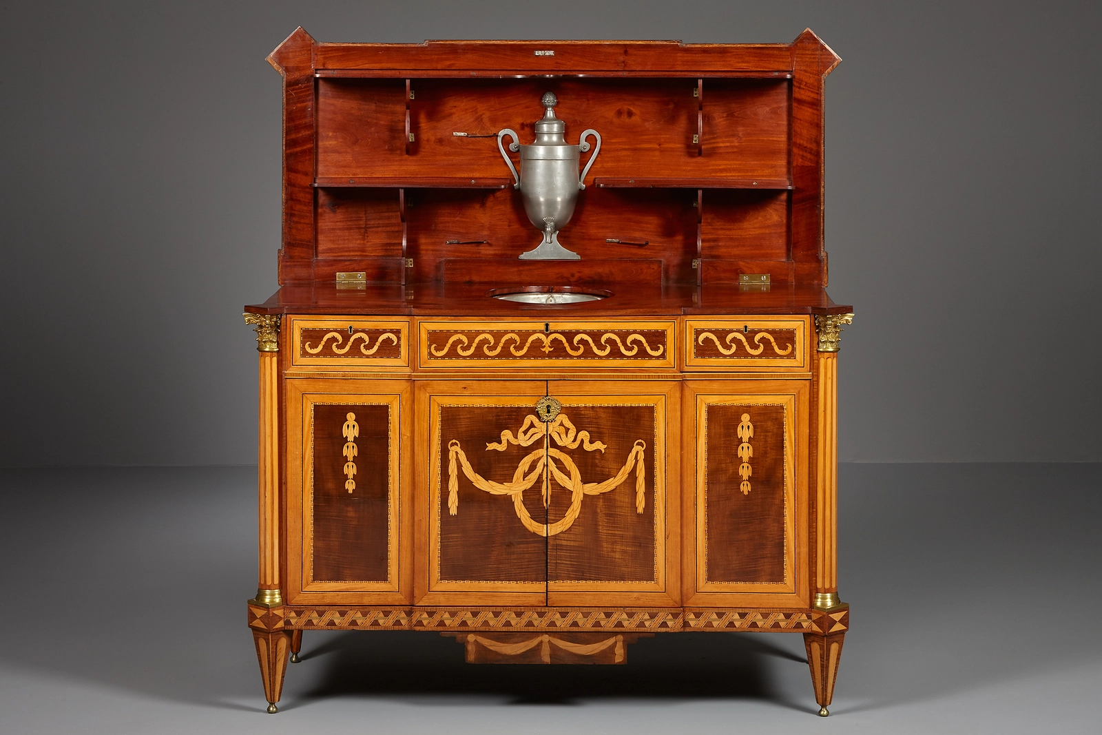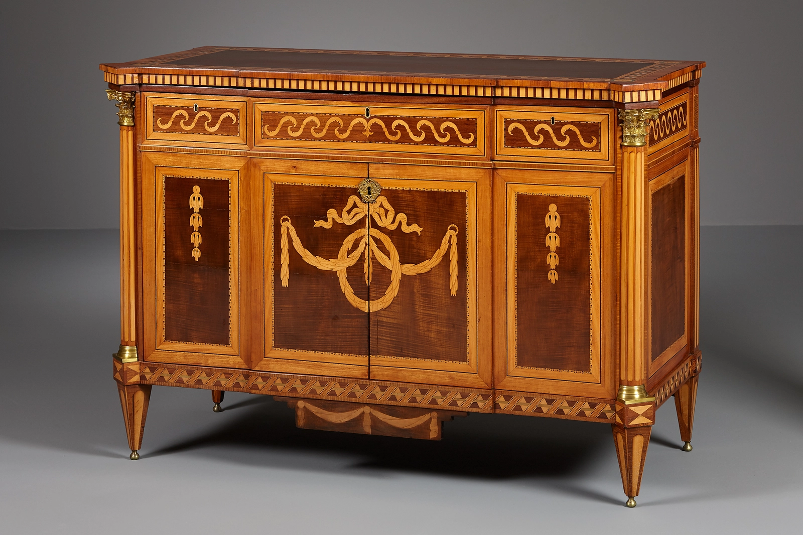 Het buffet staat op overhoeks geplaatste, taps toelopende poten die eindigen in bronzen bolpootjes. De poten zijn gefineerd met cannelures. Het rechthoekig kastlichaam heeft een vooruitspringend middendeel en een fraai getrapt en ingesnoerd schortstuk dat gedecoreerd is met een afhangend guirlande. Tussen de uitspringende hoeken van de boven- en onder-regel bevinden zich gecanneleerde zuilen met een basis en fraai gevormde Corintische kapitelen van verguld brons. De bovenkant van de opstand is ingelegd met diverse houtsoorten. De opstand is op het front, de uitspringende hoeken en aan de zijkanten afgewerkt met een tandlijst. Het front van het meubel wordt, onder het fries, gevormd door de dubbele deuren die gedecoreerd zijn met een strik, guirlandes en een lauwerkrans. De buitenste deuren tonen in het midden een afhangend guirlande. Boven deze middelste panelen bevindt zich in het uitspringende deel van het fries een schijnlade. Deze wordt geflankeerd door afsluitbare laden die beide, net als de schijnlade een zeer verfijnde decoratie van acanthusranken dragen.