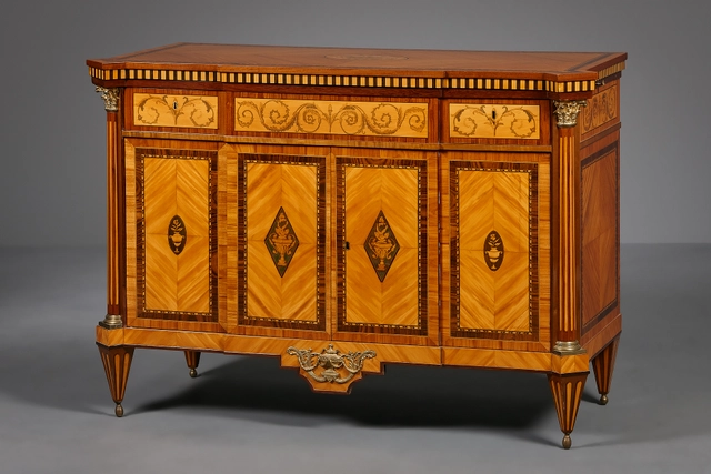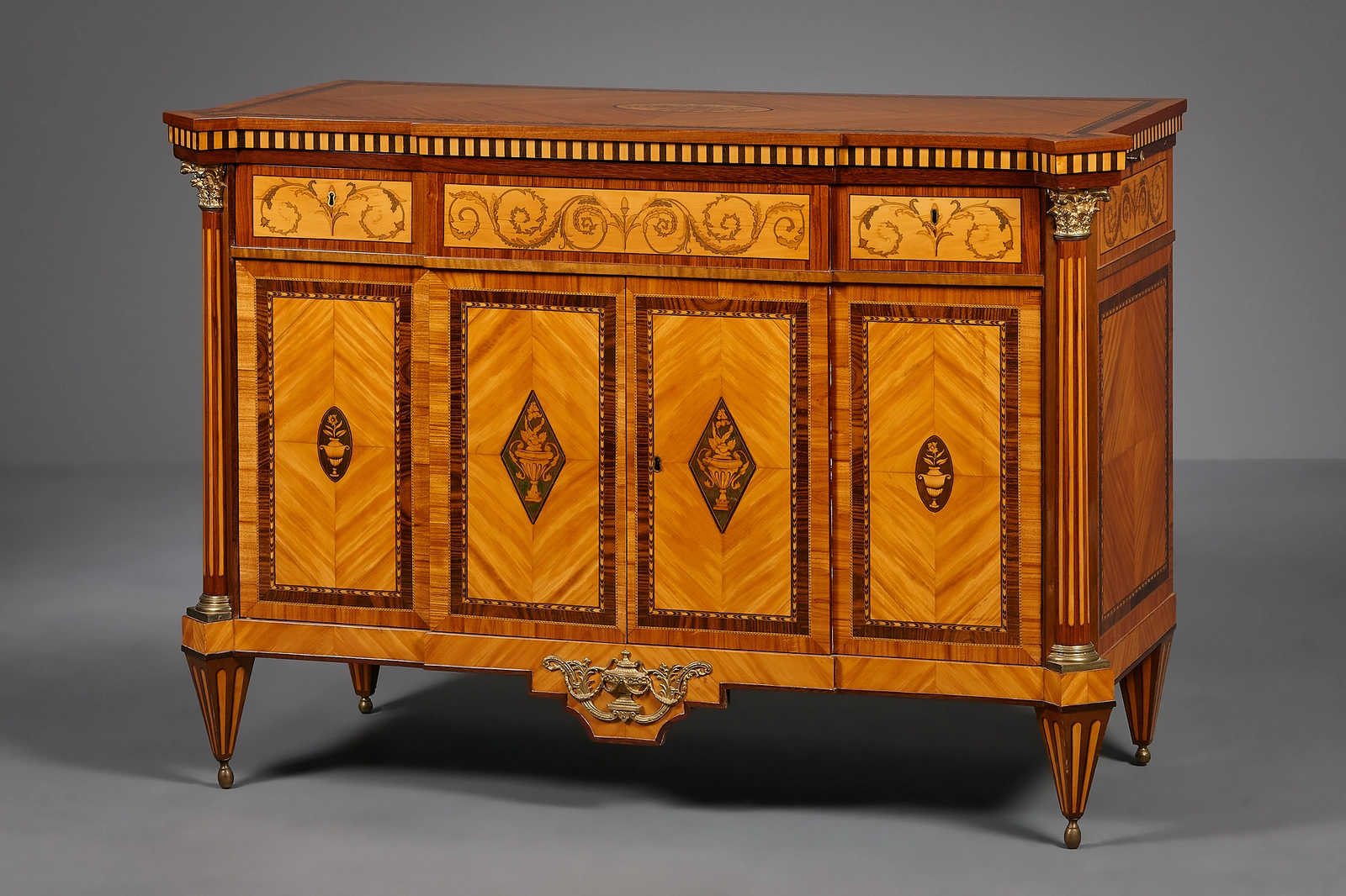 Het buffet staat op overhoeks geplaatste, taps toelopende poten die eindigen in bronzen bolpootjes. De poten zijn gefineerd met cannelures. Het rechthoekig kastlichaam heeft een vooruitspringend middendeel en een fraai getrapt en ingesnoerd schortstuk dat gedecoreerd is met beslag in de vorm van een klassieke dekselvaas geflankeerd door S-voluten en bladranken.