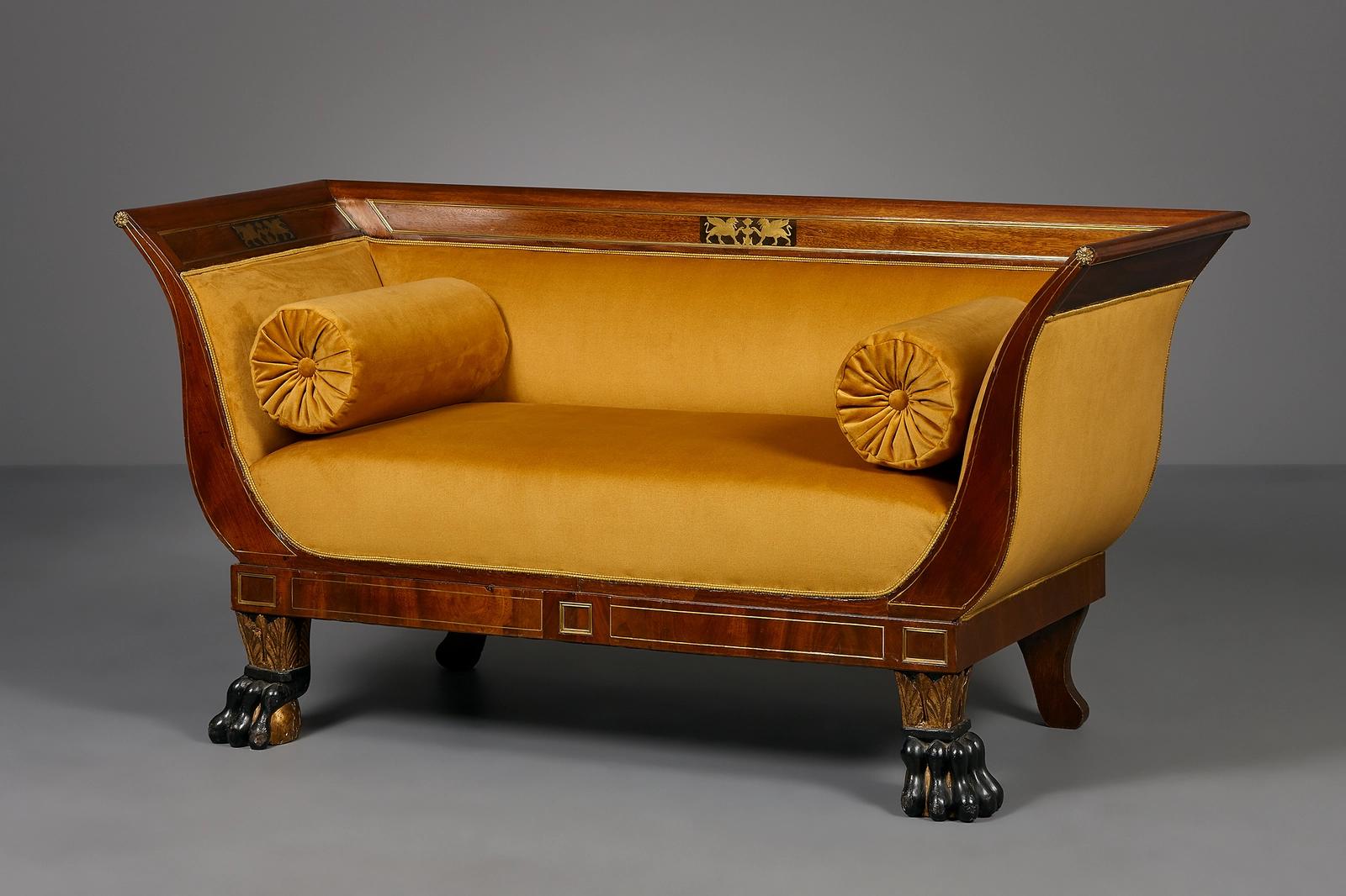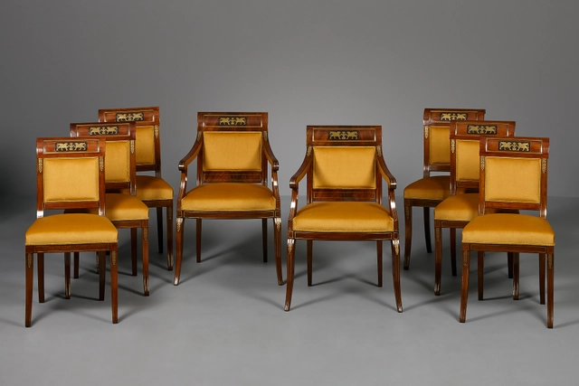 Een elegante Hollandse Directoire salon, bestaande uit een canapé, zes stoelen en twee fauteuils. Alle meubelen zijn gemaakt van massief en gefineerd mahonie, versierd met messing banden, en ebbenhouten plaquettes met messing inlegwerk van twee griffioenen met een vaas, in de rug. De stoelen en fauteuils staan op sabelpoten, en de gondelvormige canapé wordt gedragen door verguld en gezwarte mahonie klauwpoten.