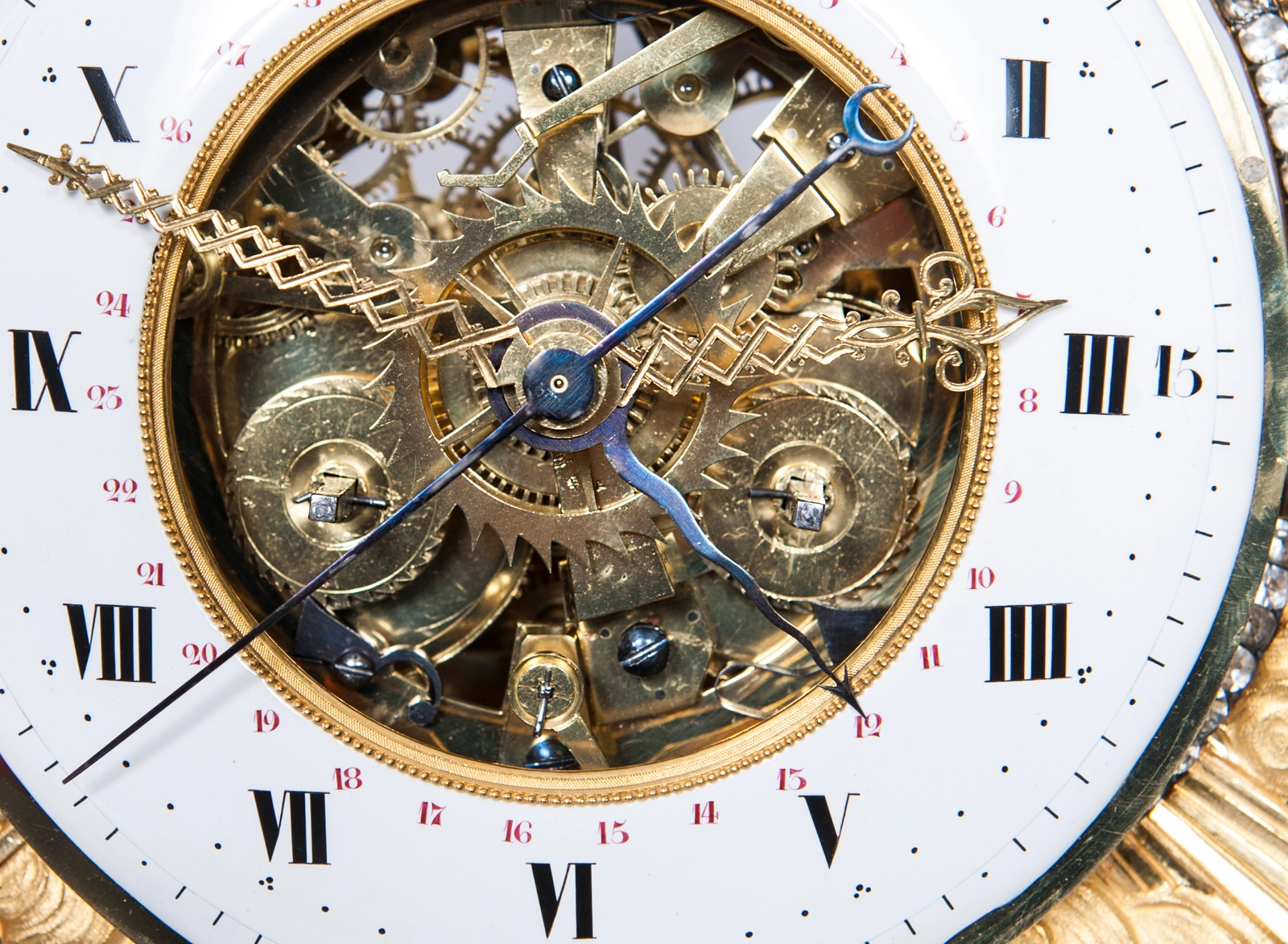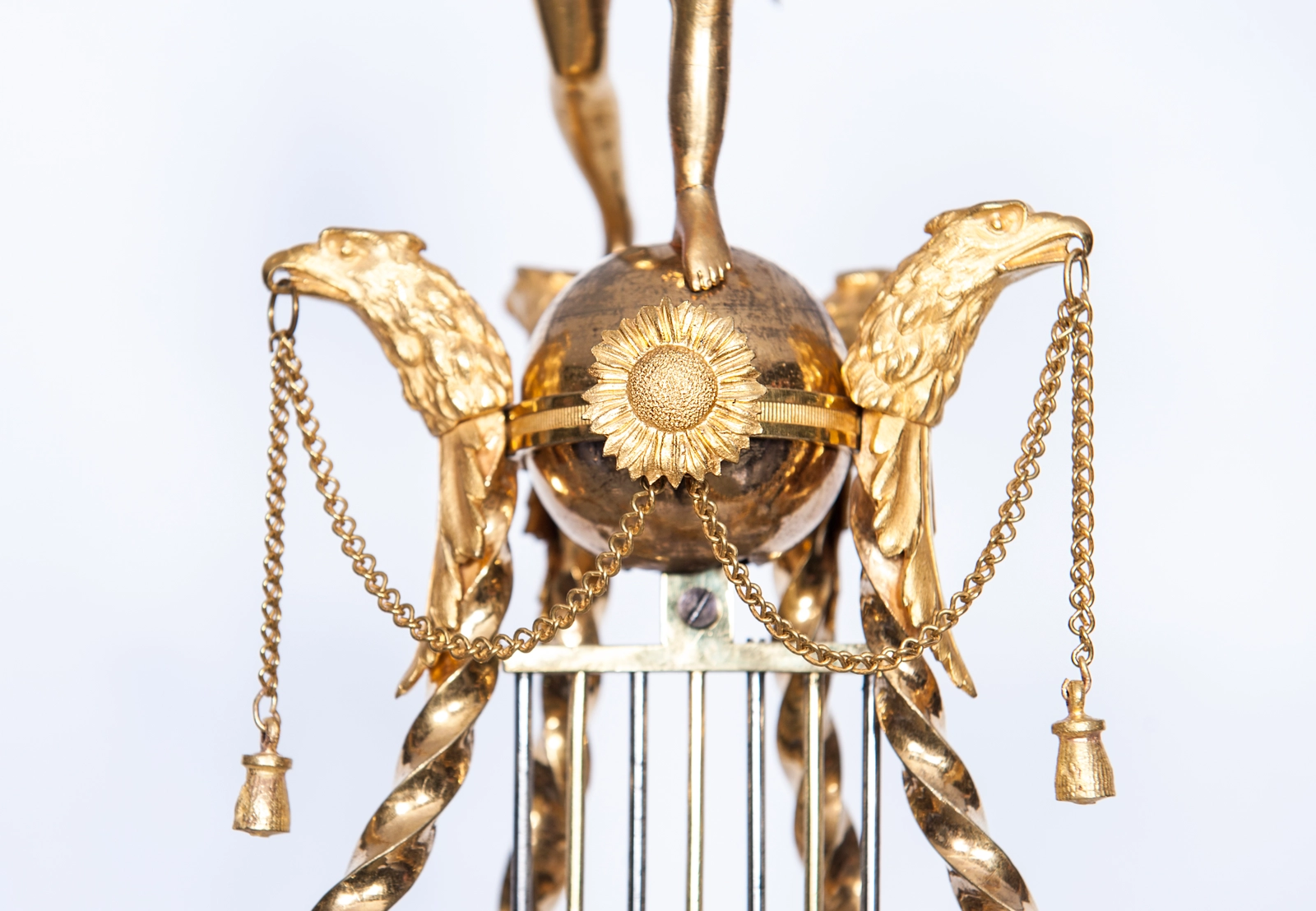 M175 Louis XVI leeuwpendule, met geskeletteerd uurwerk, zilveren wijzers en montuur op de lunette en slagwerk op een zilveren bel.
