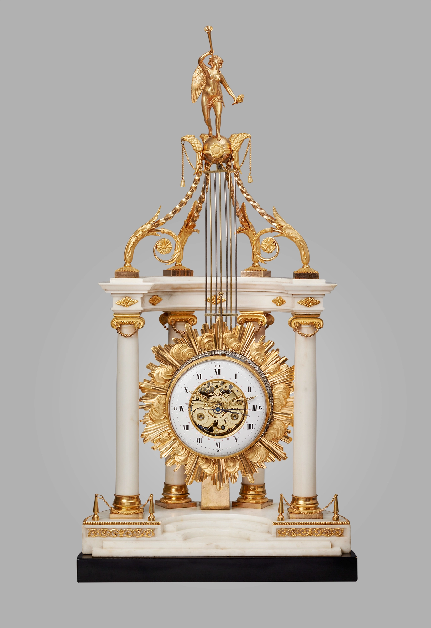 Een mooie Franse Lodewijk XVI marmeren 'cercles tournants' pendule met verguld bronzen monturen, door Barancourt, omstreeks 1780