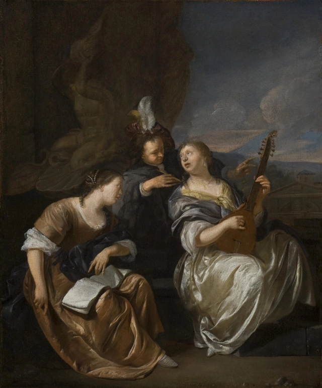 This charming painting depicts three elegantly dressed persons, seated outdoors near a sculpted fountain. The group consists of two young ladies and a man, who are making music. The lady at the left side of the composition wears an orange silk gown with a dark blue scarf. A richly embroidered white shoe peeks out from underneath the rim of her skirt. Her knotted brown hair - of which one lock curls down her neck and another over her left shoulder - is decorated with a string of pearls. In her lap rests a rectangular shaped book with sheet music. She gazes up to a man standing next to her. The man is dressed in blue and wears a purple velvet muffin cap, adorned with a white and a beige feather, tied with a ribbon. In his right hand he holds a flute. His attention is focussed on the young lady sitting in front of him. This lady wears a white silk gown, that elegantly runs down along with the curves of her legs. She has a light blue silk stole wrapped around her shoulders, over a yellow shawl that surrounds her décolletage. The lady’s neck is embellished with a string of pearls and her left ear features a teardrop-pearl earring. A string of her curled brown hair runs down over each of her shoulders. She has her face turned to the right, gazing upwards to the man with the flute. She is playing a cittern, that rests on her right knee. As customary of the period in which this painting was executed, the top of the pegbox of the cittern is decorated with a small carved head1. The company is situated outdoors, at the foot of a large sculpted fountain. This fountain shows remarkable similarities to the Triton Fountain (in Italian the Fontana del Tritone), a fountain located in the Piazza Barberini in Rome. It was designed by the well-known Baroque sculptor Gian Lorenzo Bernini (Naples, 1598 – Rome, 1680) and executed in 1642/43. At its centre rises a larger than life-size muscular Triton, a minor sea god of ancient Greco-Roman legend, depicted as a merman kneeling on the sum of four dolphin tailfins. His head is thrown back and his arms raise a conch to his lips from which water spurts2. In the background, on the right, several Classical buildings are depicted, with an Italianate mountainous landscape beyond.