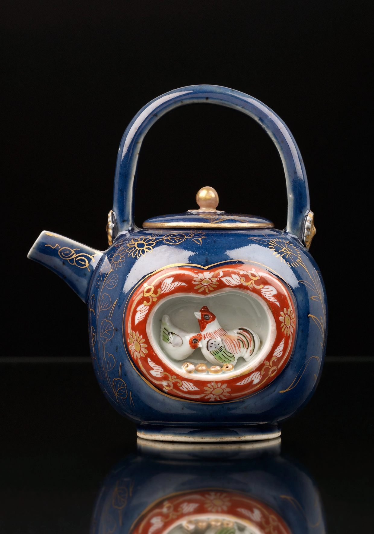 Dit trekpotje is vervaardigd in Japan aan het eind van de zeventiende eeuw. Het is gedecoreerd met poudre Bleu. Aan beide zijden bevindt zich een verdiepte cartouche met daarin gemodelleerd een kip met eieren en een bos bloemen Dergelijke verdiepte cartouches met dieren bloemen of figuren komen voor op vazen flessen en theepotjes en zijn slecht een korte periode gemaakt waarschijnlijk omdat het te bewerkelijk en daarmee te duur was. Deze gemodelleerde verdiepte cartouches komen alleen voor op Japans export porselein. Chinese imitaties zijn niet bekend. De haan met vijf kuikens is een voorbeeld van het zorgzame ouderschap.