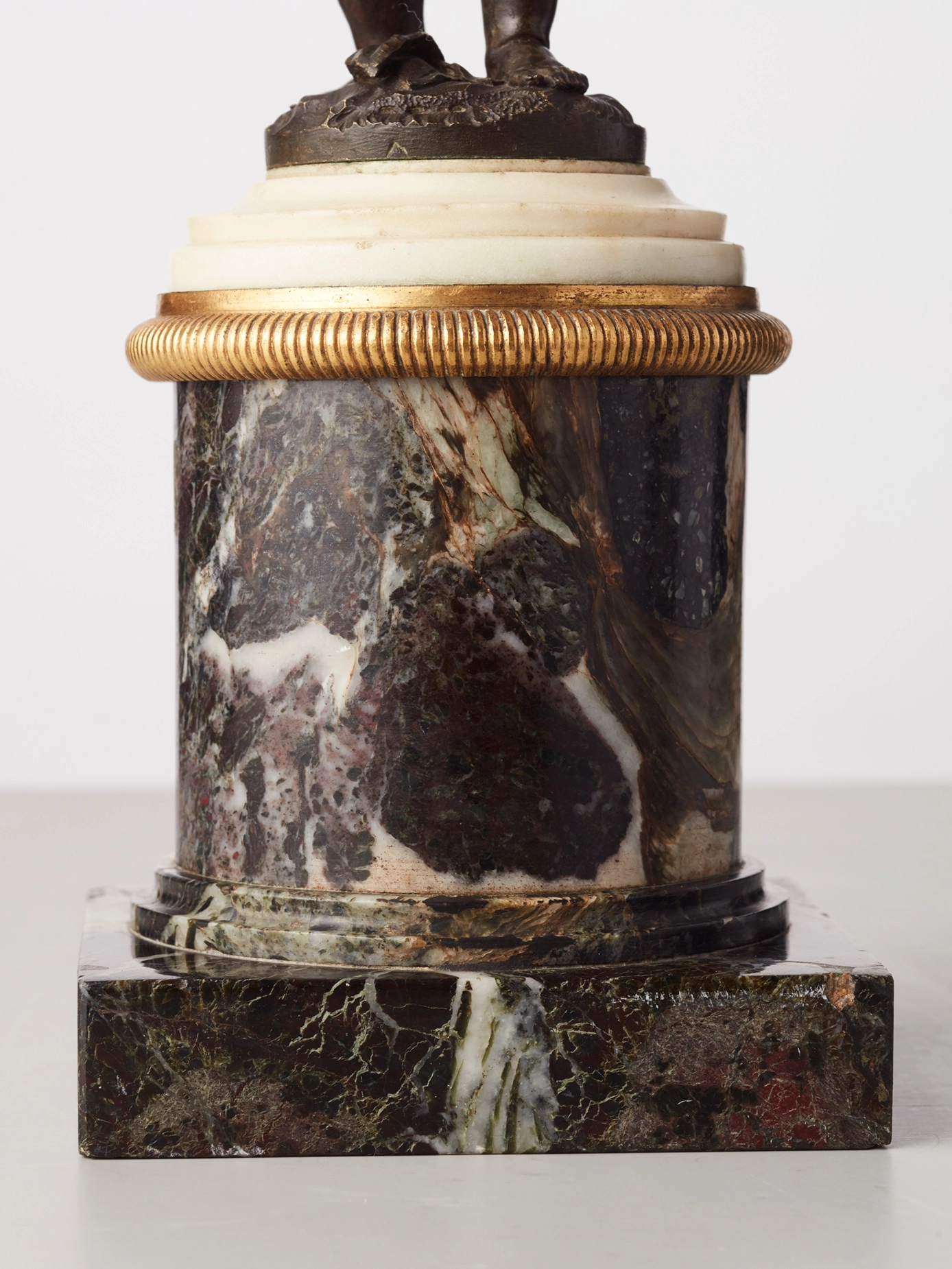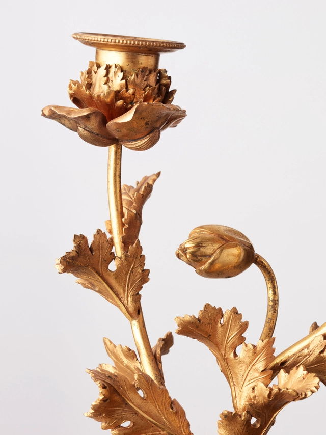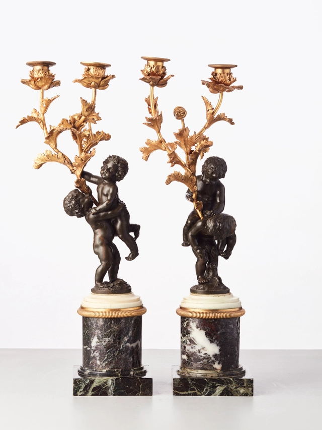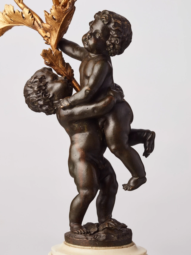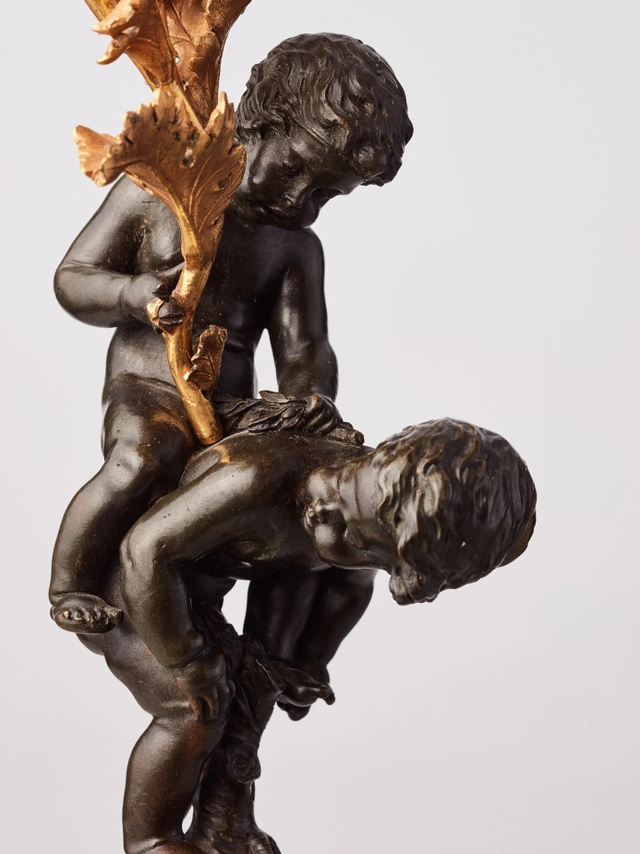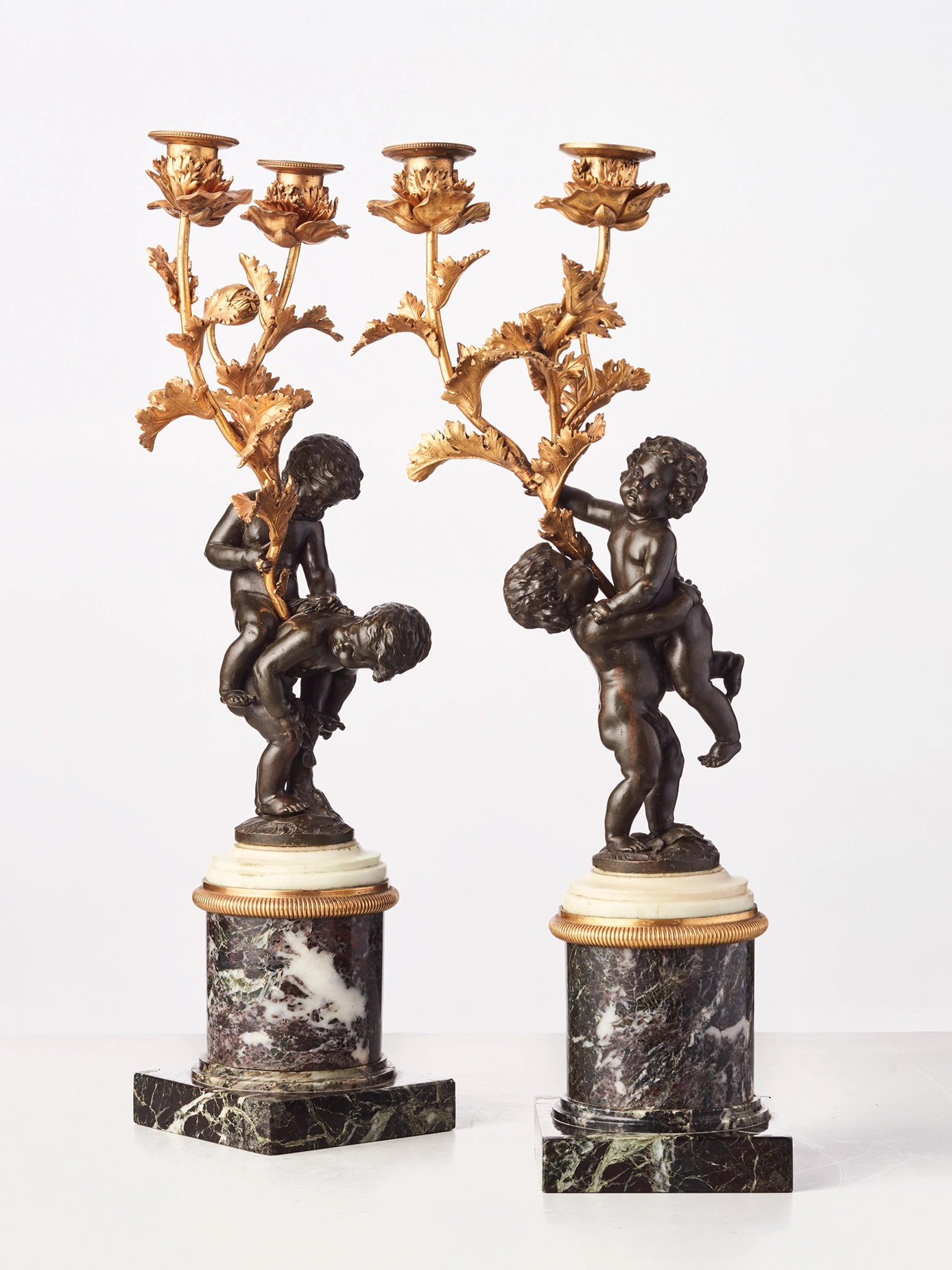 Een stel Franse verguld en gepatineerd bronzen kandelaars naar ontwerp van Alfons Giroux, omstreeks 1880