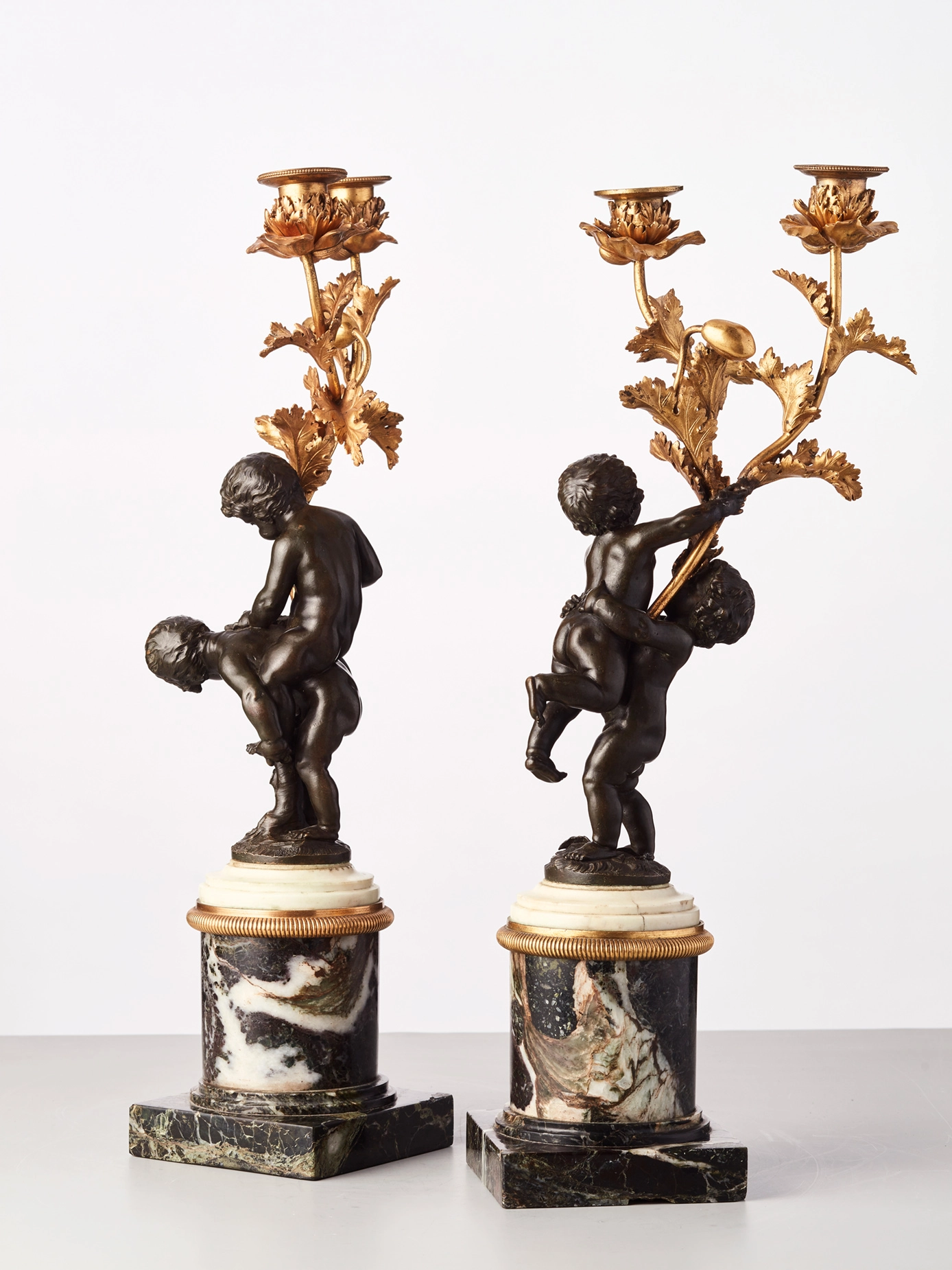 Een paar gepatineerd en verguld bronzen kandelaars Harlekeins circa 1880