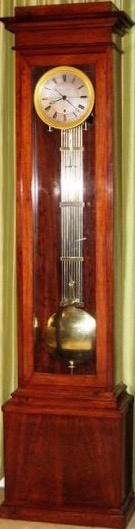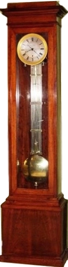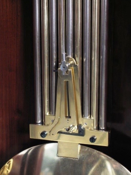 The escapement of the very well executed movement, which is mounted externally on the backplate, employs jewelled adjustable dead beat pallets. All the wheelwork has five crossings. The substantial plates of the movement are cut out at the bottom corners for the very heavy cast brass bracket to which it is fixed by two steel bolts with large knurled brass heads and from which the massive gridiron pendulum is also suspended. The bracket is bolted to the backboard by four steel bolts. The long crutch descending from the movement has beat regulation and is provided with stop pins to prevent any damage to the jewels in the pallets.
