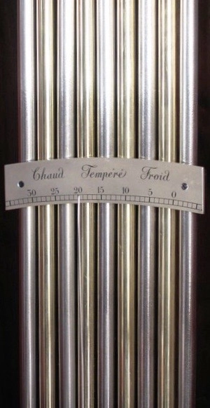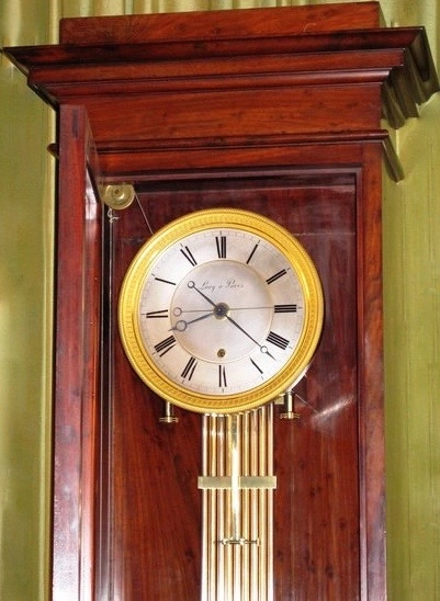 The gridiron pendulum, with nine steel and brass rods, is a very fine feature of the clock and may well have been made by another member of the Lory family who is recorded by Tardy as a pendulum manufacturer. It is particularly well finished and employs a long hand rising up from the bob to a silvered plaque extending across the nine rods which is inscribed Chaud; Tempere, Froid and graduated from 0- 30 degrees.
