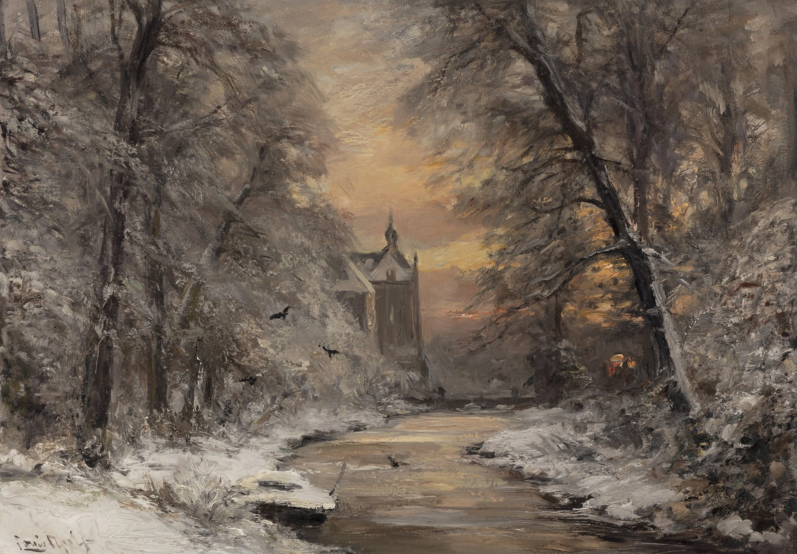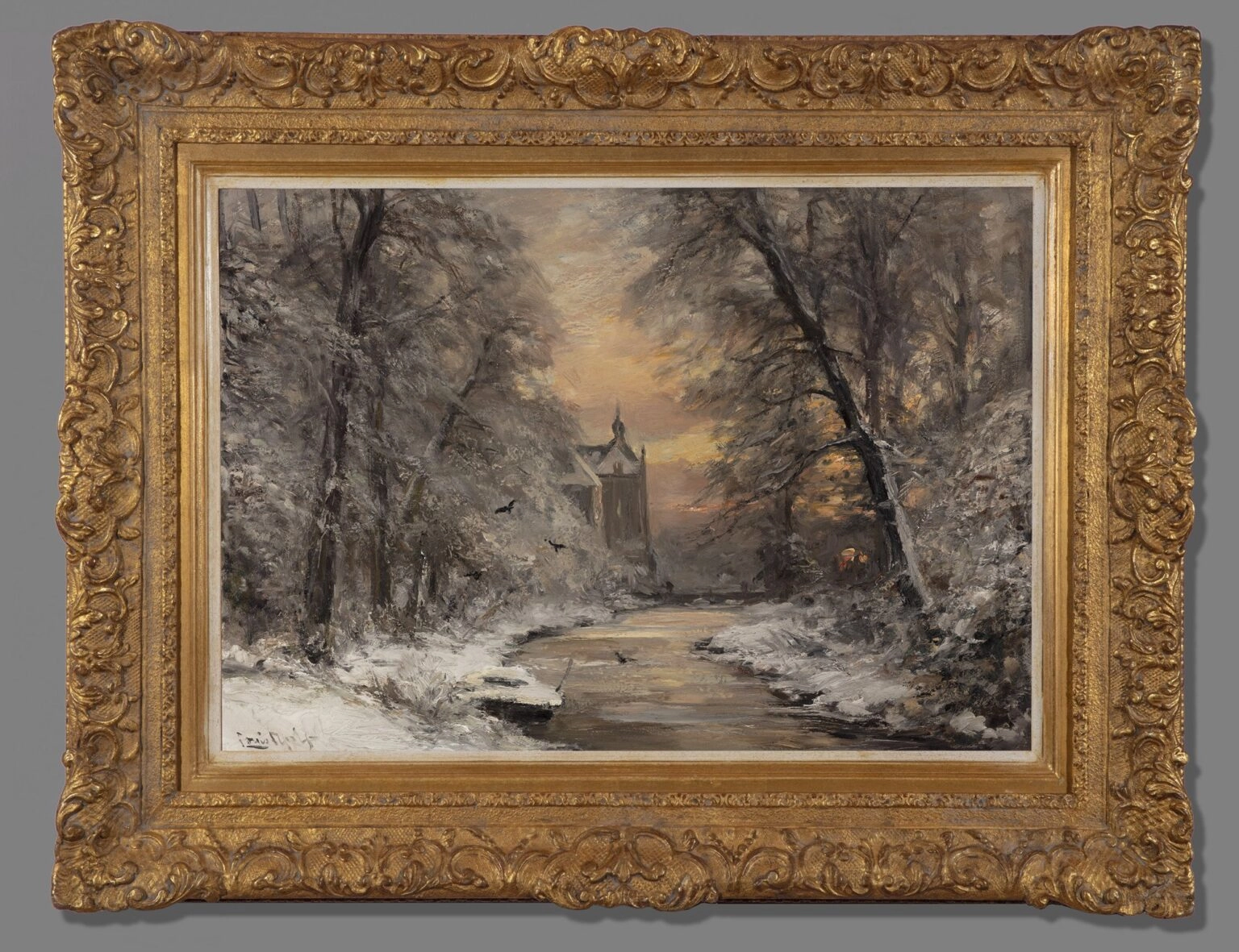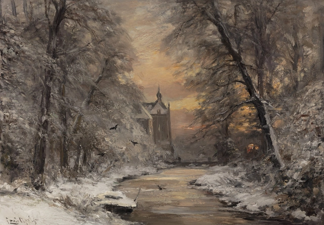 Upon the death of the famous winter landscape artist Andreas Schelfhout (1787-1870), Louis Apol was heralded by a critic as his promising successor at the age of only 21. Apol had his true breakthrough at the age of 24 at an exhibition of living masters in Amsterdam with the winter scene A January Evening in The Hague Forest. With this painting Louis Apol made clear to all that he was indeed a marvelous painter of winter scenes, while also modernising this genre. Apol moved away from the anecdotal winter scenes from Schelfhout and painted the stillness of winter in a new colour palette. Nature and the ambience was the main subject and people were placed in the paintings only as staffage. In his works, Apol truly captured the ambiance of winter, the stillness, the solitude and the decaying nature.