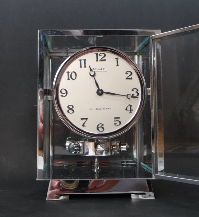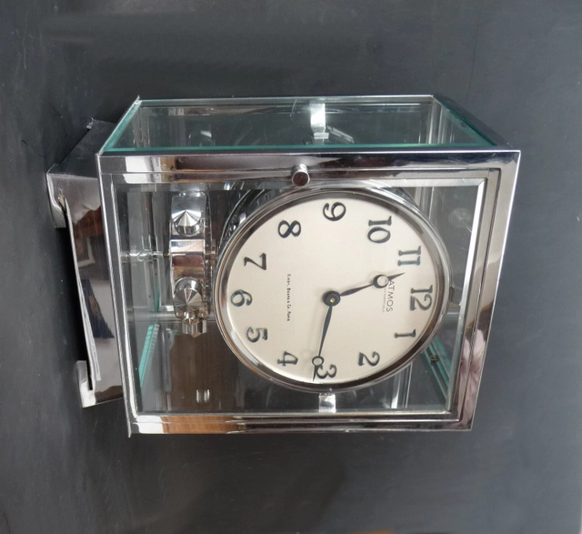 M122 Vernikkelde Art Deco stijl J.L. Reutter 4 zijdig verglaasde Atmos klok, in kleine uitvoering.