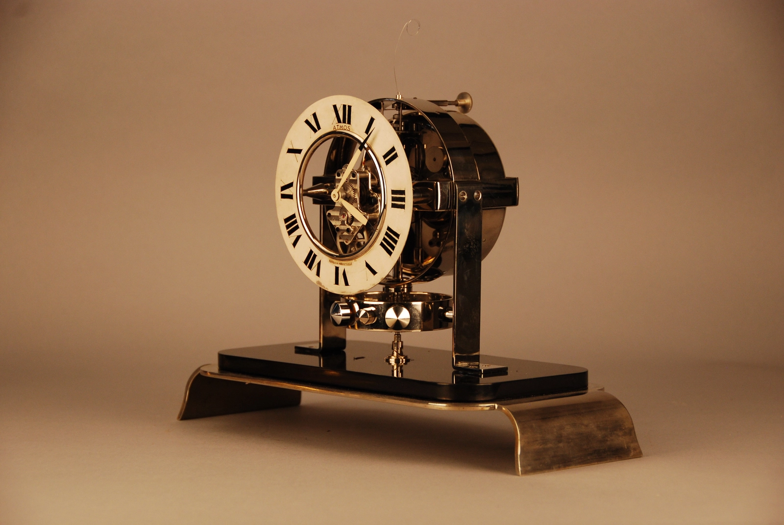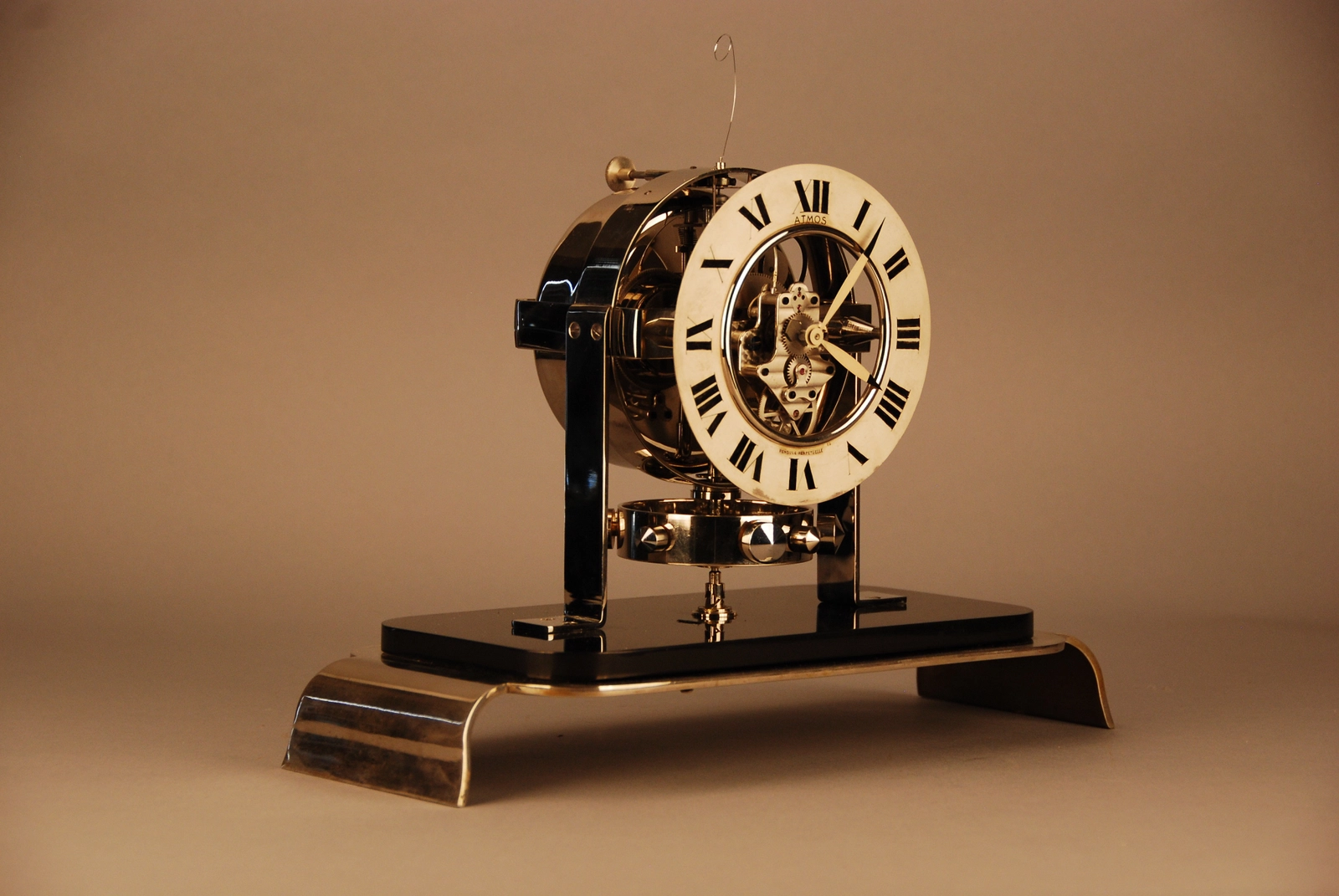 De klok heeft een geskeletteerde wijzerplaat met Romeinse cijfers. Aan de achterkant van de klok zit een plaatje met de vermelding ‘Brevets J.L. Reutter, S.G.D.G.’ en het serienummer 3613. Op de verzilverde wijzerplaat staat de tekst Atmos, Pendule Perpétuele, Made in France. Werking: Het uurwerk werkt door middel van een trommel met een U-vormige buis gevuld met kwik en een gas. Temperatuur schommelingen veroorzaken in de trommel een thermiek die ervoor zorgt dat de buis die om een as gemonteerd is, een heen en weer beweging gaat maken. Deze oscillatie of slingerbeweging, die zich hernieuwt bij temperatuurswisselingen, wordt doorgegeven aan een tandwiel van het uurwerk met een terugslagbegrenzing. De temperatuur en de atmosferische druk dragen bij tot een permanente aandrijving of een ‘Pendule Perpétuelle’. De kast en het uurwerk zijn authentiek en in een goede staat.Zeldzaam en uniek naar technisch ontwerp en Art Deco vormgeving en origeel glazen stolp. Het principe is ontdekt en gepatenteerd door ingenieur J.L. Reutter