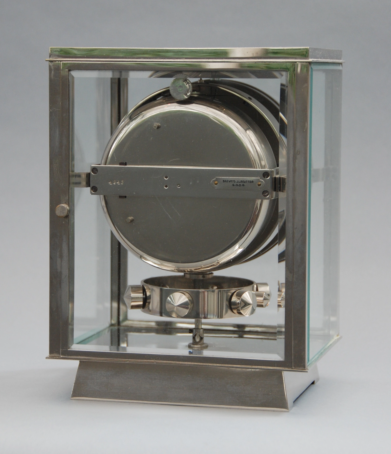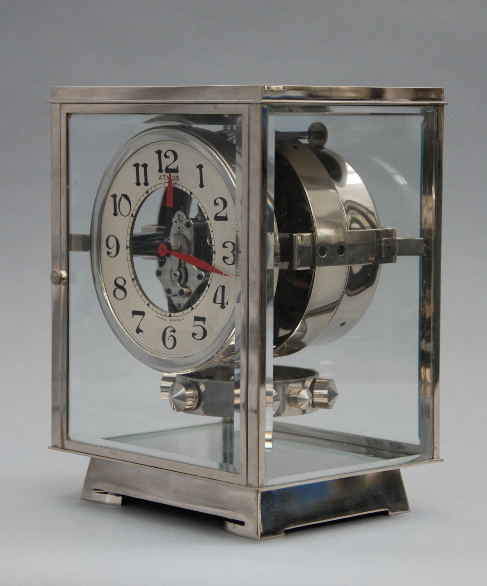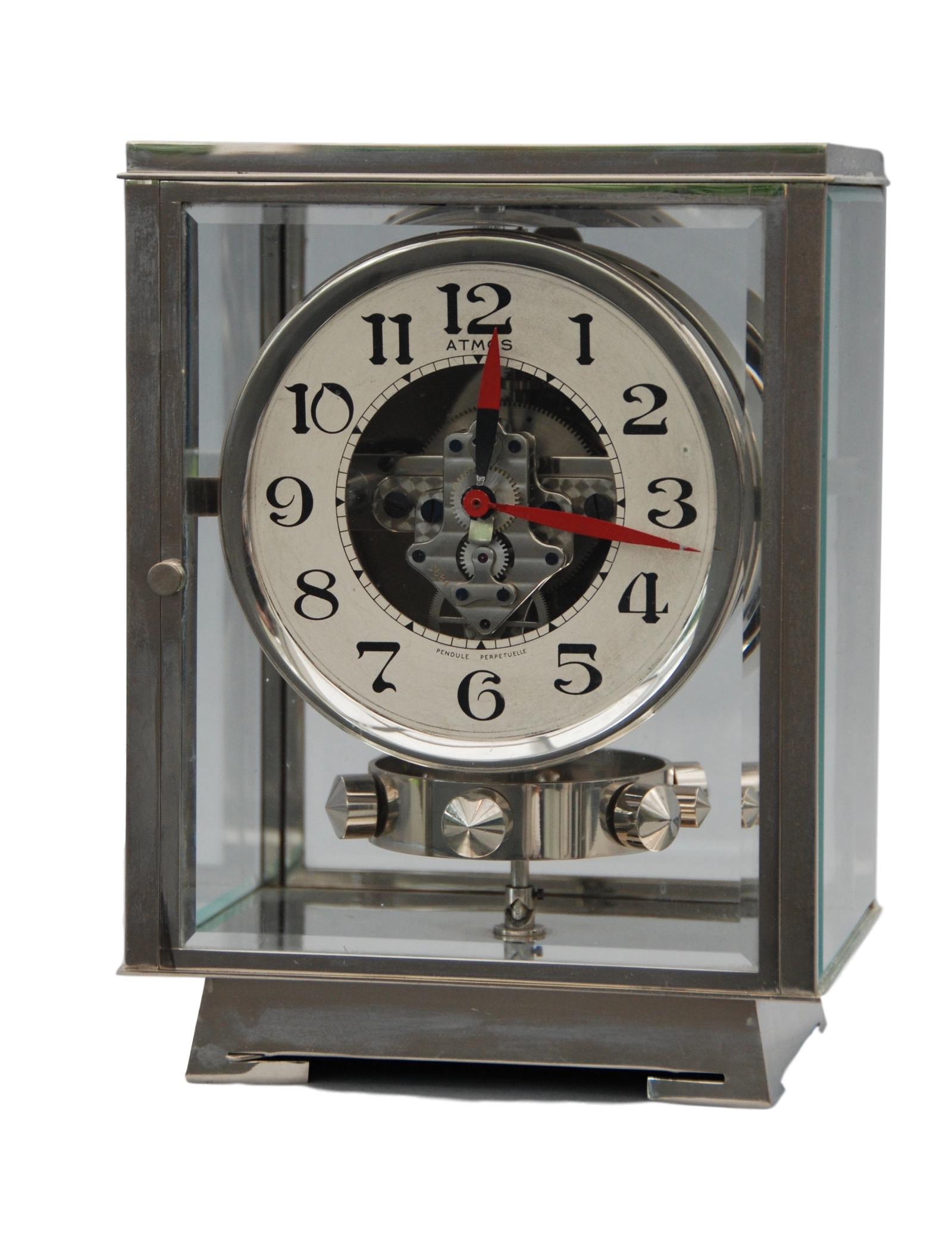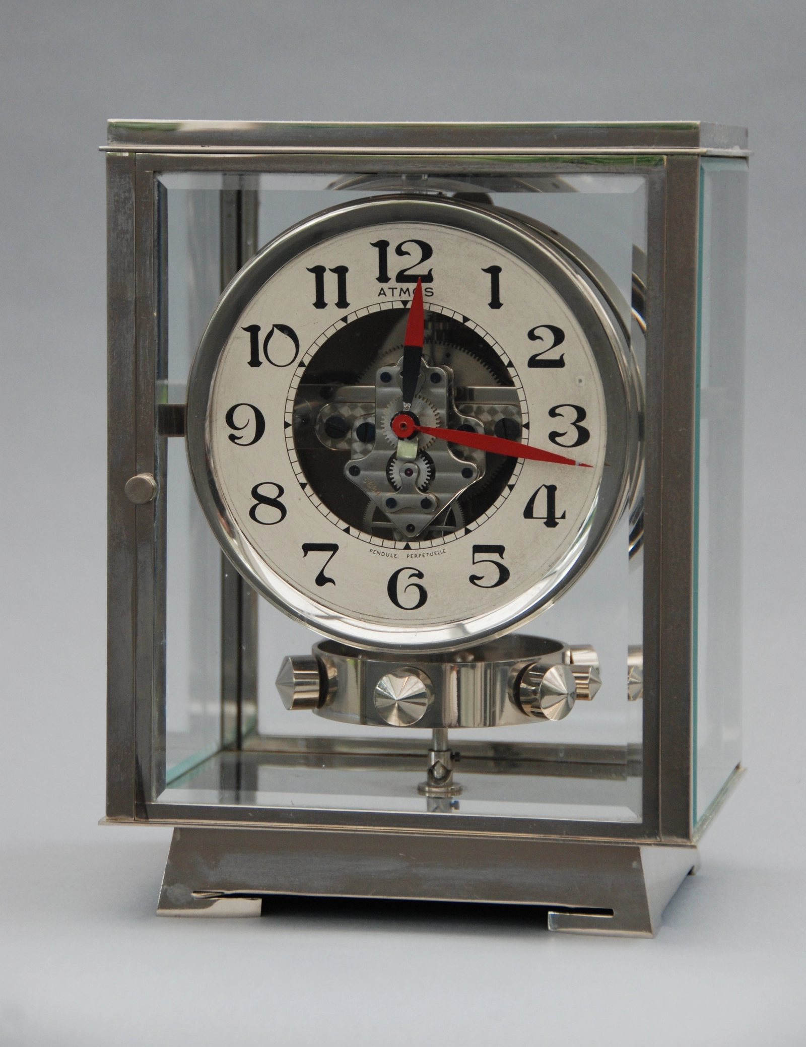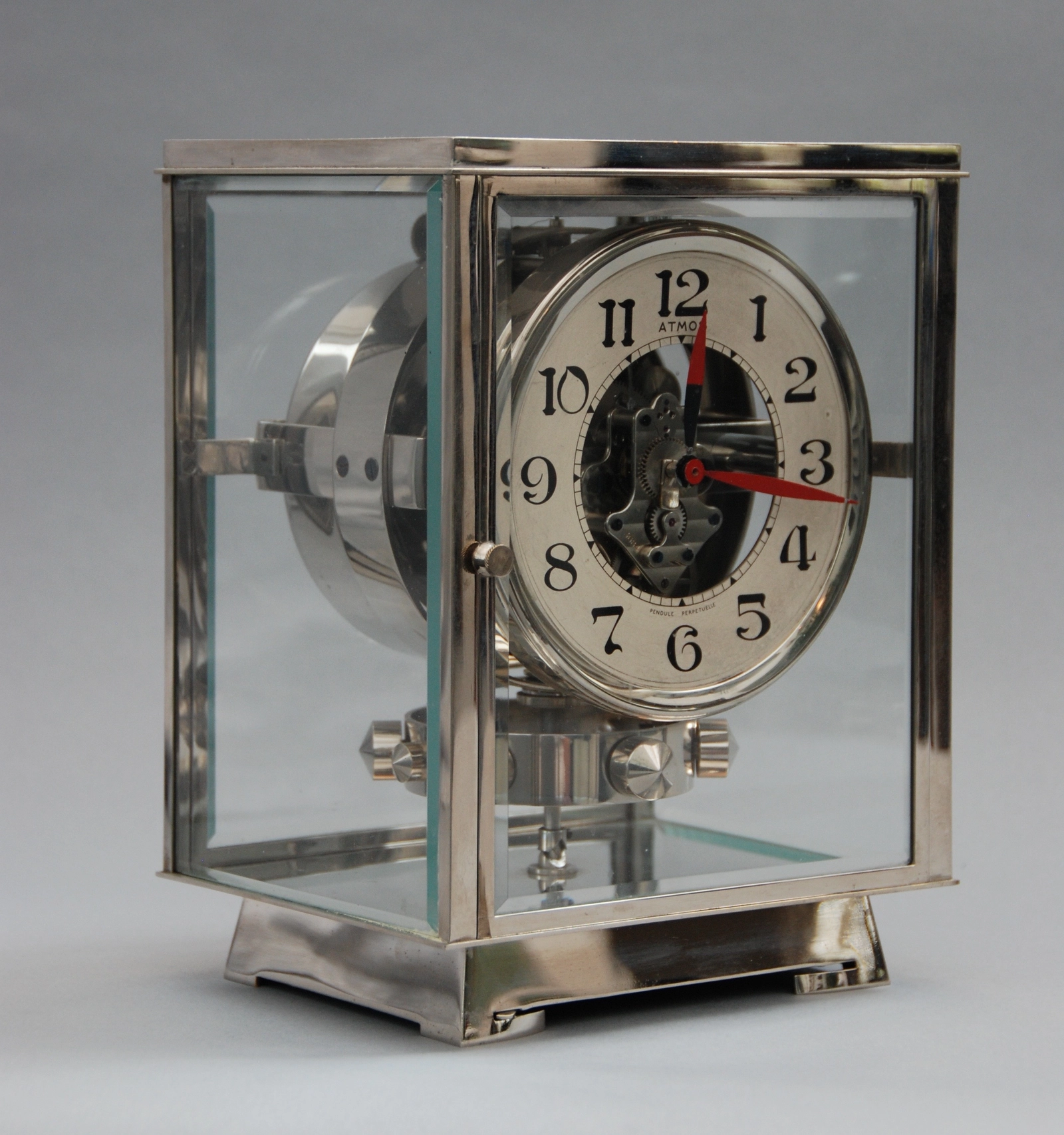 Een vroege 1930's Nikkel art deco JL Reutter vier glazen Atmos klok, de grote nikkelen vier glazen kast in een art-decostijl met een gesigneerde creme kleurige wijzerplaat met Arabische cijfers en zeer bijzondere, rood/zwart beschilderde dolk wijzers, de wijzerplaat gesigneerd Atmos, Pendule Perpetuelle.