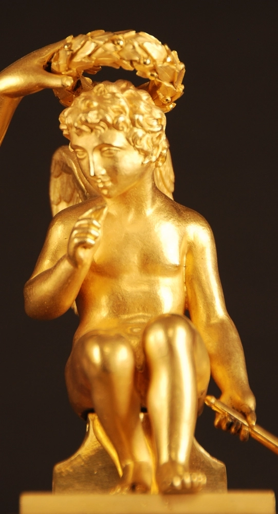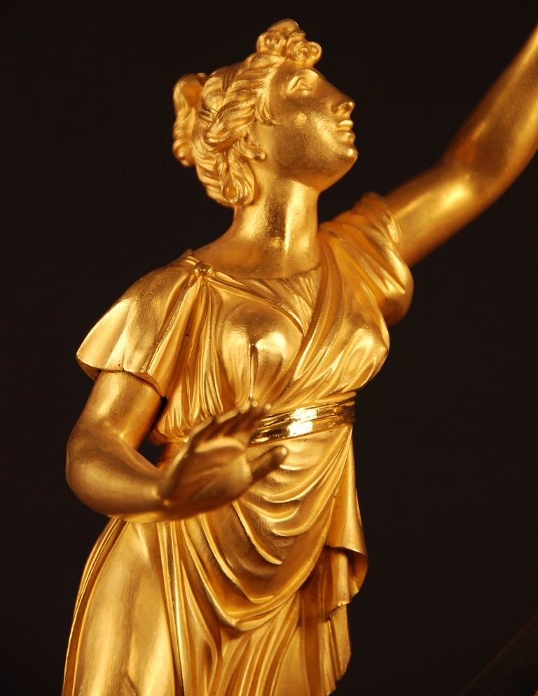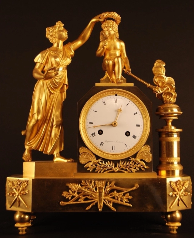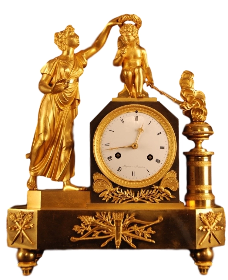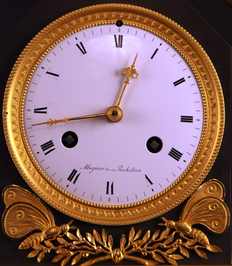 Vergulde pendule in zeer goede staat, gesigneerd 'Mugnier rue Richelieu', Frankrijk ca 1820.