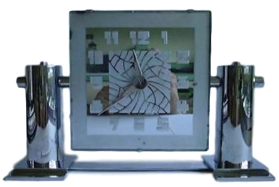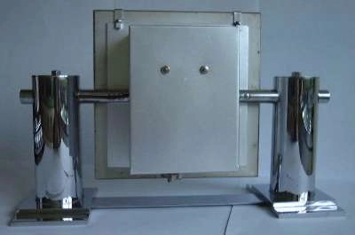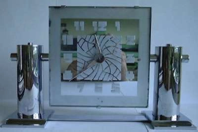 c.1930 Chrome Electric Mantle Clock, Bulle, France. A very rare early 20th century battery powered mantle clock by the Bulle clock company. The case is chromed with the exception of the mirror backed etched glass dial which is signed 'Bulle-Clock, France' along the lower edge. The battery is stored in one of the side towers with the wires running along the crosspiece. The movement is a conventional Bulle movement using the same basic principles as the first clocks produced when the company was established about 1920. It is notable that Bulle clocks were fabricated in England after 1934, but they used entirely different materials for the magnets and the pendulums. Although there were nearly 300,000 clocks produced between 1920 and 1952 the vast majority still available are glass domed. This piece truly represents the Art Deco period in which it was manufactured. Height - 8in.