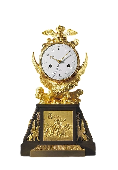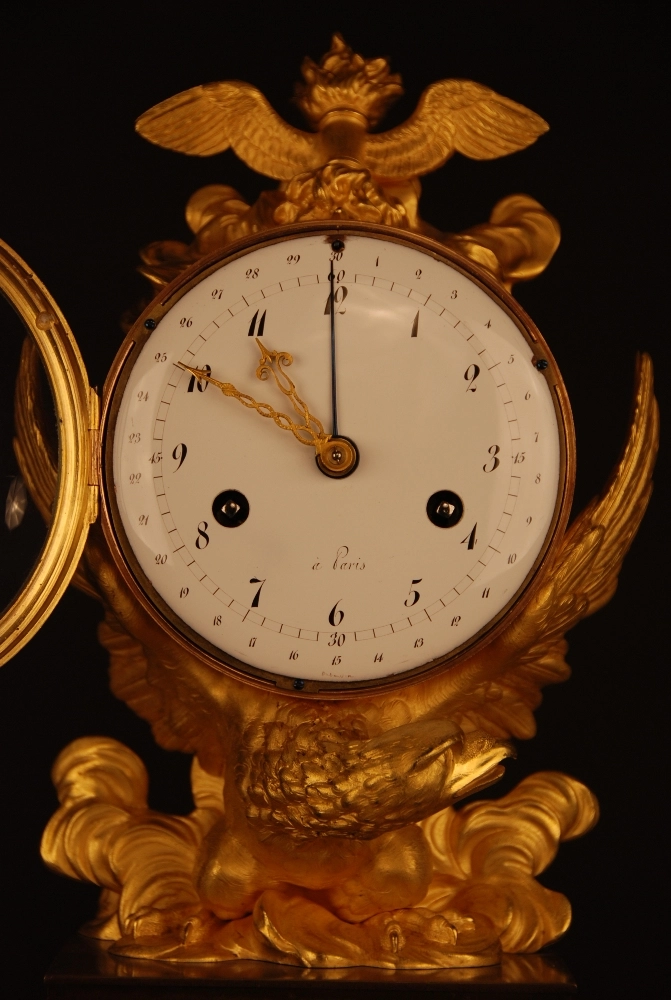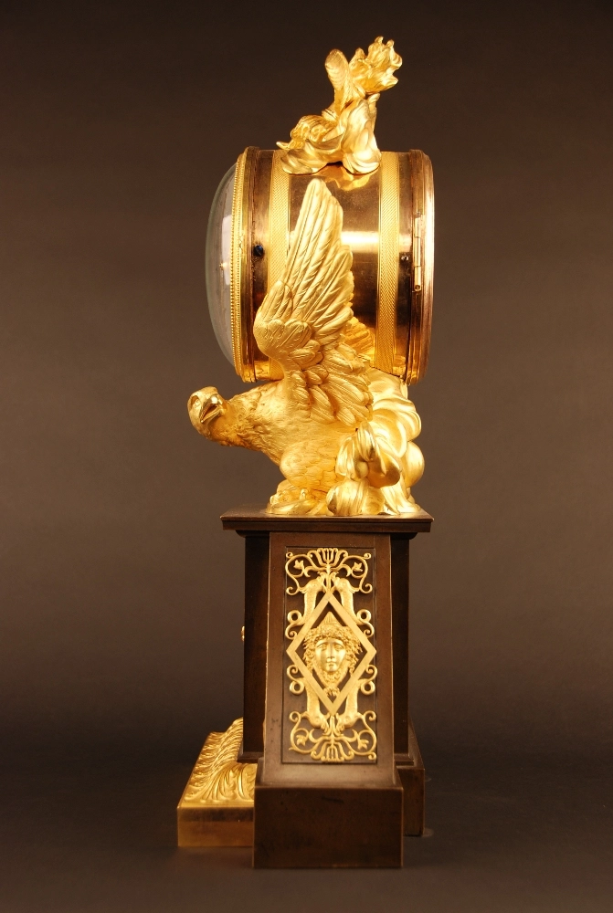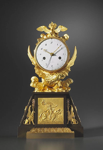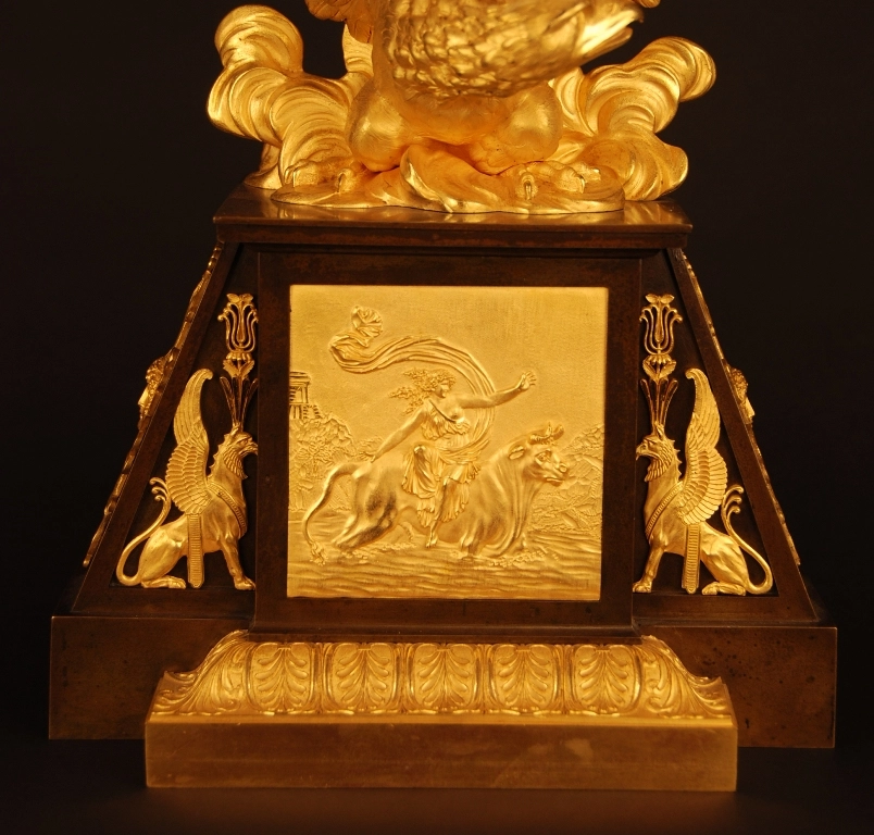 A very rare Directoire - 1793-95 - gilt and patinated bronze mantle clock of eight day duration, the white enamel dial signed a Paris, with Arabic numerals for the hours and minutes and outer Republican numerals 1-30 for the days of the month, with pierced gilt brass hands for the hours and minutes and a blued steel pointer for the calendar indications. The movement with anchor escapement, silk thread suspension, striking on the hour and half hour on a single bell, with outside count wheel. The clock drum surmounted by a flaming torch and spread wings on a cloud and supported on the wings of an eagle, symbolising Jupiter, on a bed of clouds, upon a patinated splayed plinth decorated at centre with a mount representing the Rape of Europa, the mount flanked either side by two winged griffins supporting vase-shaped coronets and lyres upon their heads, each side mounted with an Apollo mask with a pair of dolphins above and below amid foliate scrolls, the front with a projecting acanthus cast stepped border This rare clock case is of superb quality and of complex design. The central mount on the plinth shows a scene from The Rape of Europa, often depicted by the Old Masters including Carracci and Titian. According to Greek mythology, Europa was the daughter of Agenor, king of Tyre and was one of the many victims of Jupiter's sexual exploits. Jupiter, the supreme ruler of gods and mortals and chief of the twelve Olympians often resorted to metamorphosing himself into another guise so as to escape the jealousy of his wife Juno. To this end he disguised himself as a shower of rain when encountering Danaë, a swan with Leda, an eagle for Ganymede and as here a white bull. He appeared to Europa on the seashore where she played with her attendants. Deceived into thinking that all was well, Europa placed garlands of flowers around the bull's horns and climbed upon its back. He then promptly took her across the water and back to Crete, where resuming his normal form he had his way with her. In keeping with the story the clock case also shows other of Jupiter's attributes. At centre, just below the dial he appears as an eagle, not only to represent him in disguise but also referring to an incident when an eagle flew toward him just before he succeeded in defeating the Titans and thus the eagle became a symbol of victory. In the same way flames and wings also allude to his victories. The sides of the plinth show an Apollo mask; Apollo being one of the twelve Olympian Gods was the twin son of Jupiter by one of his lovers, Leto. Interestingly his face is accompanied by four dolphins, which in some paintings, such as one by Titian, are shown in the water ridden by putti as Europa and the bull speed across the sea. The case also includes overtly Egyptian decorations in the form of winged griffins as well as the pyramidal shape of the plinth. Such designs reflect France's growing interest in Egypt, which emerged during the mid eighteenth century, was encouraged by the publication of Piranesi's designs of Egyptian ornament, 1769 and later fuelled by Napoleon's Egyptian campaign of 1798. The dial, with its lack of a makers name as well as the 30 day calendar ring, indicates that the clock was made during the Revolutionary years. Clockmakers, formerly patronised by royalty and aristocracy were now reluctant to advertise their names on the dials and thus as here, had the dial painter simply inscribe the words 'a Paris'. In 1793 a new Republican time system was introduced. This new decimal system stipulated that the months should be divided into 30 rather than 31 days, the days into ten hours and hours into 100 minutes. Few dials show true Revolutionary time but some, such as this example, show the new calendar divisions. However, the new time scale proved so complicated that in 1795 it was abandoned in favour of the former Gregorian system.