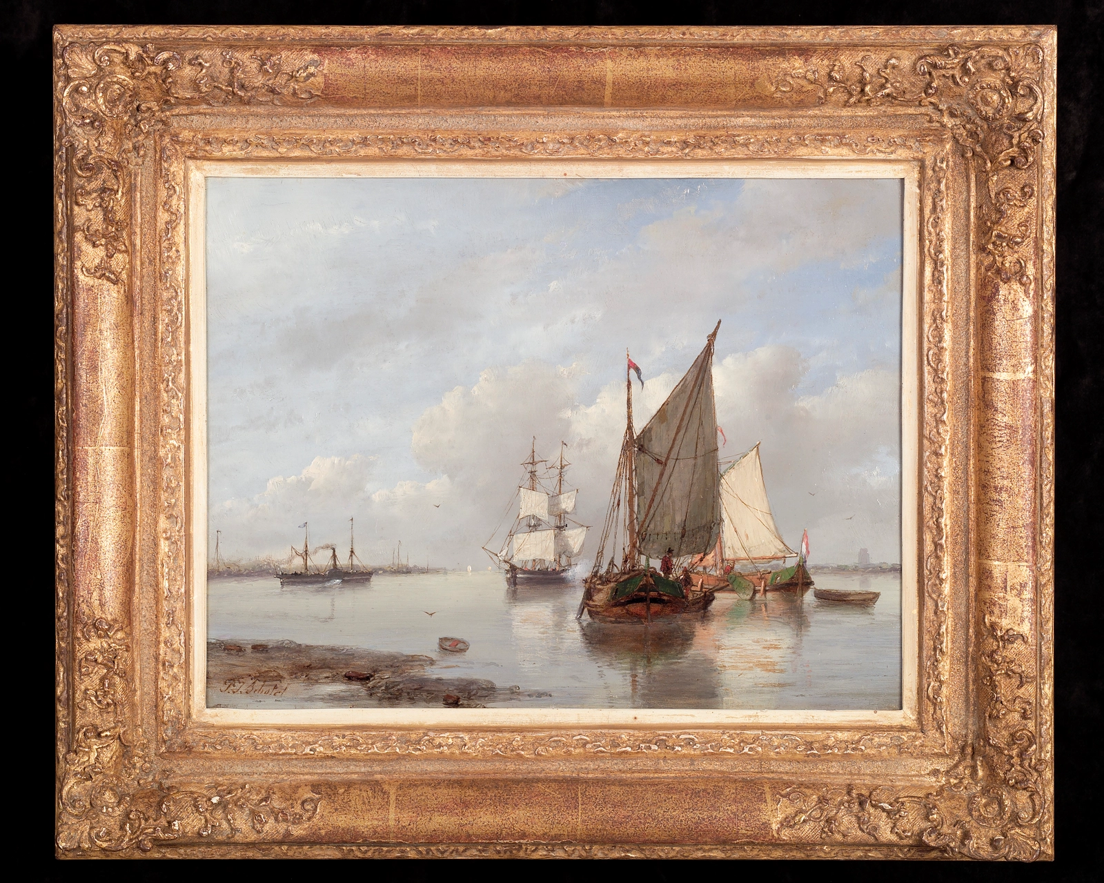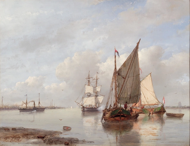 De monding van een rivier met enkele vissersboten, een tweemaster en een stoomschip. We zien aan de linkerkant aan de horizon de oevers van de rivier meer schepen en daaraan gerelateerde ambachten. Aan de rechterkant een stad met het silhouet van een stompe toren. Op de voorgrond aan de linkerkant zien we de modderige banken bij eb. De horizon wordt laag gepositioneerd in deze presentatie, met een duidelijke diagonale samenstelling van de linkerbenedenhoek naar de rechterbovenhoek van het schilderij geplaatst. Dit wordt nog benadrukt door de grote zeilen en de wolken die de dezelfde diagonaal volgen. De voorstelling is geschilderd in ingetogen kleuren; verschillende tinten van grijs, blauw en bruin, met sommige felgekleurde lijnen op de voorgrond die om aandacht vragen. De delicate lijnen van de tuigage en het detail in de voorgrond contrasteert prachtig met het panorama van de typisch Nederlandse bewolkte hemel. Petrus Johannes Schotel (Dresden Dordrecht 1808-1865) was de zoon en leerling van de kunstschilder van zeegezichten Johannes Christiaan Schotel (1787-1838). Hij woonde oorspronkelijk in Dordrecht en was in dienst bij de Koninklijke Marine in Medemblik. Voor deze instelling reisde hij veel, meestal op marineschepen. Schotel woonde in Kampen van 1851 tot 1856 en werd vervolgens overgeplaatst naar Dusseldorf. Na 1860 woonde hij in Dresden, waar hij overleed in 1865.Schotel was voornamelijk bekend als schilder van zeegezichten en schepen maar werd ook etser en lithograaf. Werk van P.J. Schotel is te vinden in talloze musea; onder andere in Amsterdam in het Rijksmuseum, Museum Fodor en Nederlands Scheepvaartmuseum en in Rotterdam in Museum Boymans-van Beuningen en het Maritiem Museum.