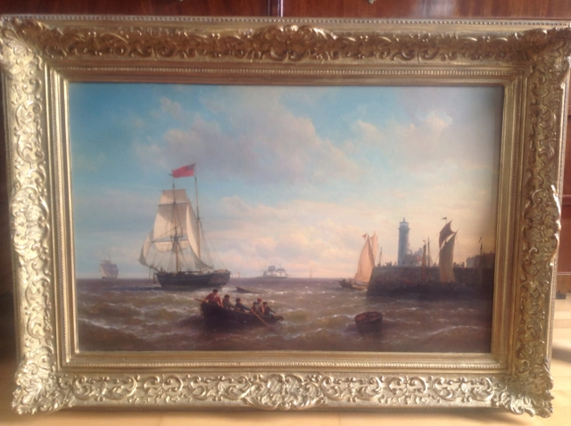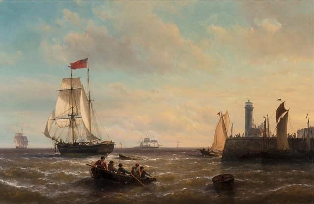 Schepen bij havenhoofd met vuurtoren, olie op doek 55,5 x 88,5 cm., ca. 1860, gesigneerd r.o.