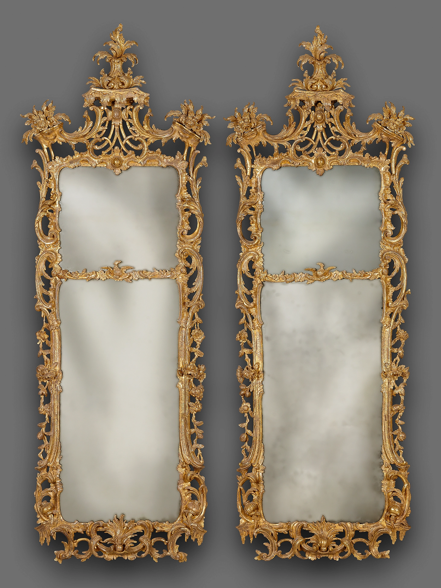 Dit paar fijn gesneden spiegels heeft een gedeeld rechthoekig bord binnen een frame met C- en S-voluten en bladwerk. De scheidingsbalk is gedecoreerd met een adelaar. De spiegels zijn zeer vergelijkbaar met een ontwerp van de getalenteerde ontwerper en meestersnijder Matthias Lock (circa 1710-1765) dat gepubliceerd is in 'A New Book of Ornaments for Looking Glass Frames Chimneypieces &c. in the Chinese Taste', 1752, afb 6. De houtbewerker heeft veel van de elementen van het originele ontwerp gevolgd: de bladranken op de hoge schouders en het centrale platform, het gestoken C-ornament bovenaan dat bijna een monogram is, de bloemenranken aan de zijden van de lijst en de omgevallen urnen in de onderste hoeken van de lijst. Ook de adelaar in het midden van de dwarsbalk komt voor op een ander ontwerp van Lock in de collectie van het Victoria & Albert Museum in Londen (inv. no. 2848:22).
