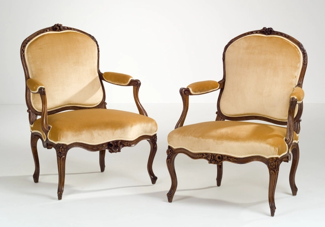 De beide, zeer brede, fauteuils zijn vervaardigd in een klassieke Louis XV-stijl, mooi van verhouding en met de rustige welvingen van stijlen en regels die typerend is voor de jaren 1750. Aan de zijkant krijgt de verbinding van de armsteunen aan de regel een bescheiden nadruk door de voluten op de regel. Al het hout is fraai geprofileerd en de rug, de onderregel en de voorste stijlen zijn gedecoreerd met snijwerk van bloemtakken. Het snijwerk is op beide stoelen verschillend uitgevoerd maar bestaat uit fraai gedetailleerde en diep gesneden rozentakken en zonnebloemen.