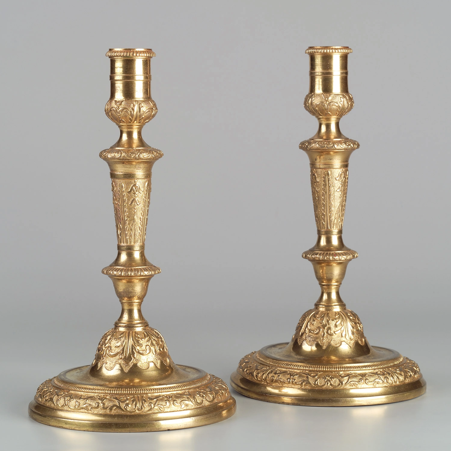 Hoewel er nieuwe vormen en motieven voor de decoratie van voorwerpen ontstonden, handhaafden verschillende Louis XIV-kenmerken zich nog een tijd. In deze kandelaars is dat duidelijk te zien in bijvoorbeeld de lambrequin aan de bovenkant van de voet, en in de rozetten en palmetten.